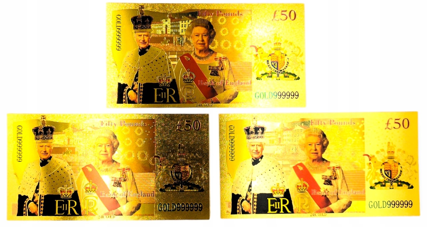 Красивый набор позолоченных банкнот с изображением короля Великобритании Карла III.