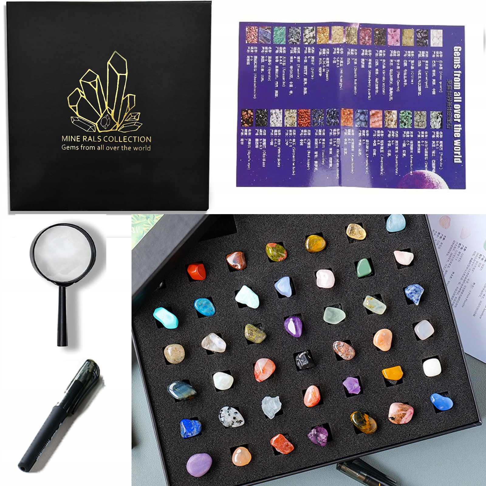 ✅в комплект входит лупа для рассмотрения экспонатов, ручка для заметок, буклет с названиями камней.