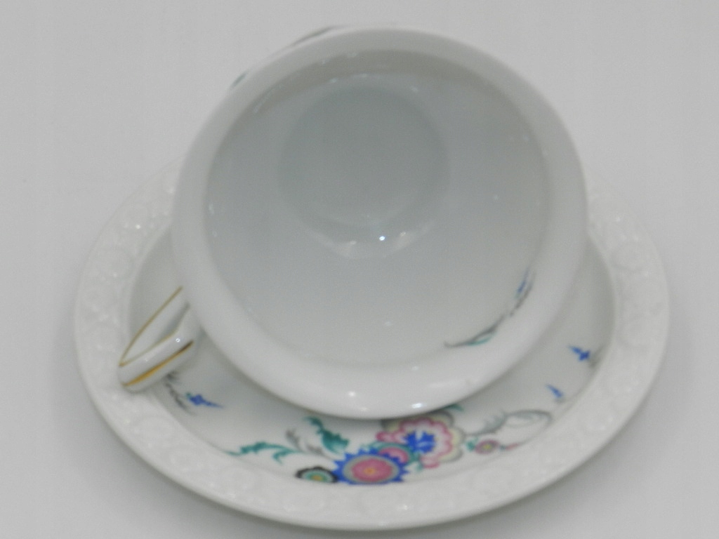 Белоснежный фарфор высочайшего качества, красивой формы и формы с красивым тиснением плодов граната по краю блюдца и основанию, на которое ставится чашка, на которой стоит чашка. характерна для модели «Мария».
