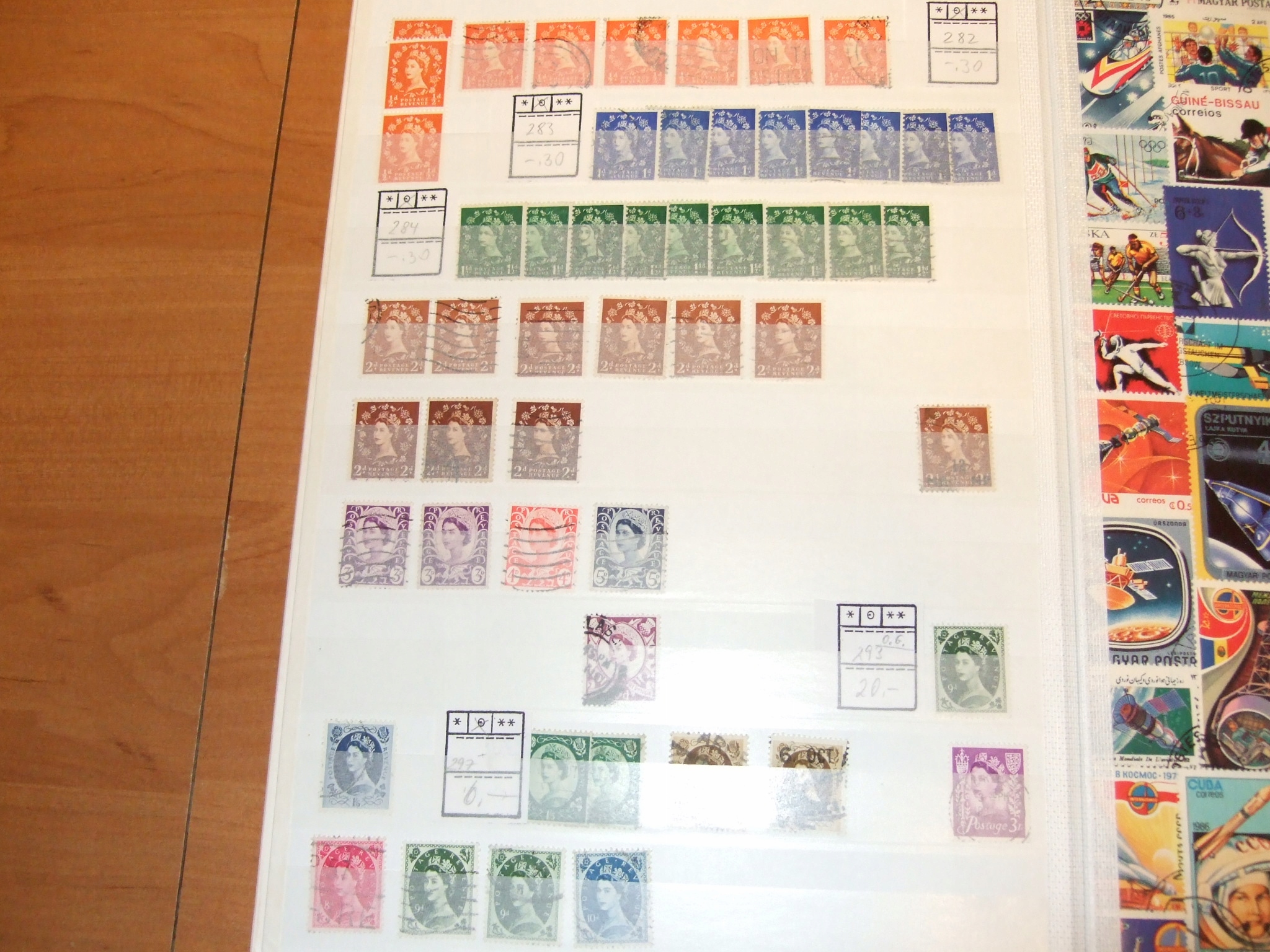 У меня есть 3 больших буклета с марками. Два кластера содержат по 12 страниц каждый, а один — 10 страниц. Классы имеют 9 строк на странице. Гроздья в хорошем состоянии, без повреждений, могут быть использованы для дальнейшей коллекции. В двух группах находится массовая британская печать с изображением королевы Елизаветы II (несколько страниц каждая, остальные страницы пусты), а в третьей группе — другие марки из Великобритании.