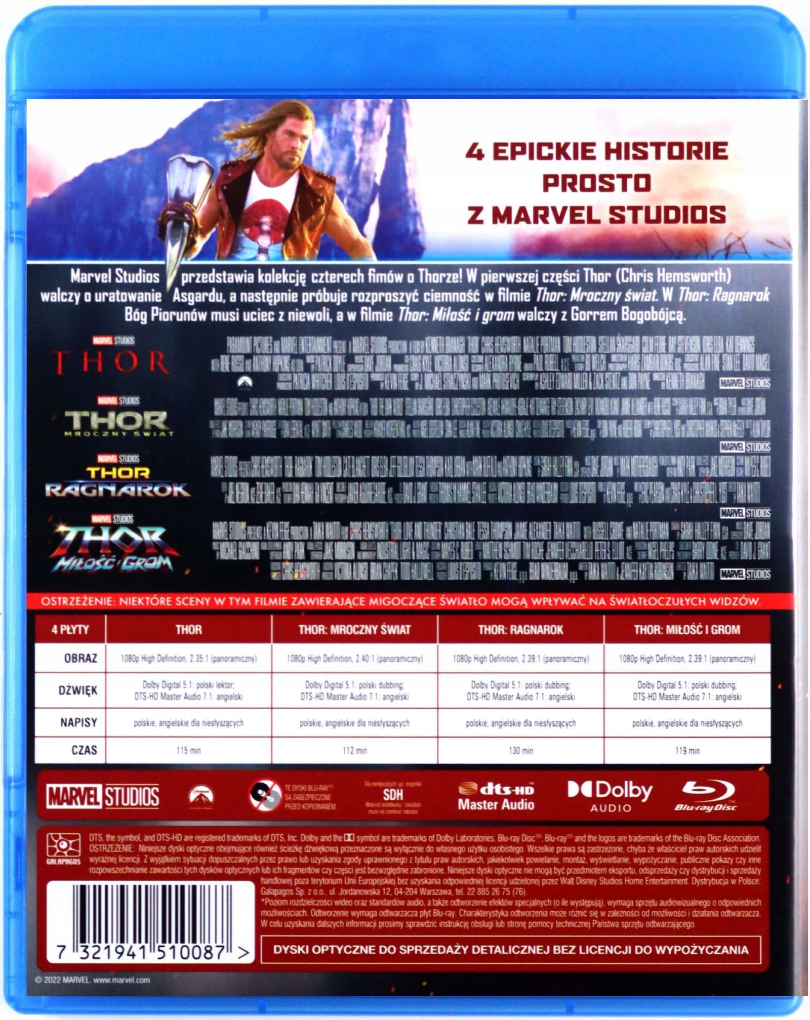 Студия Marvel представляет коллекцию из четырех фильмов о Торе! В первой части Тор (Крис Хемсворт) борется за спасение Асгарда, а затем пытается рассеять тьму в «Тор: Мир тьмы». В «Тор: Рагнарёк» Бог Грома должен сбежать из плена, а в «Тор: Любовь и Гром» он сражается с Горром Богоубийцей.