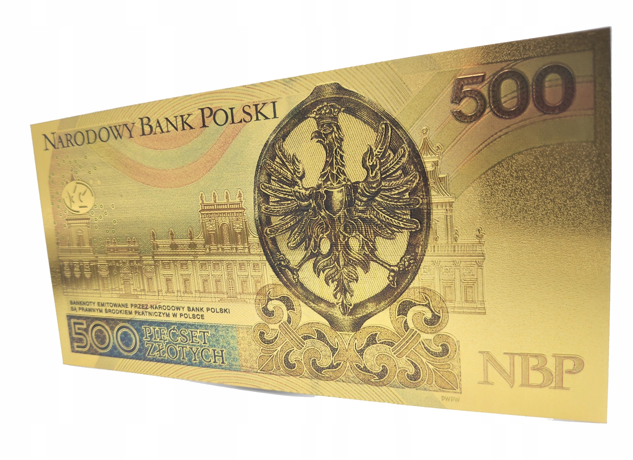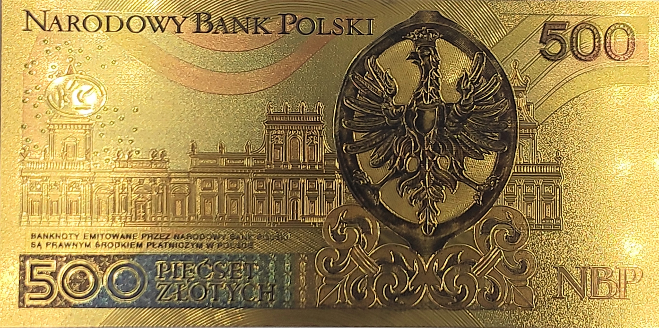 Точная копия банкноты польского обращения самого высокого номинала, изготовленная из ПВХ и покрыт цветной золотой фольгой.