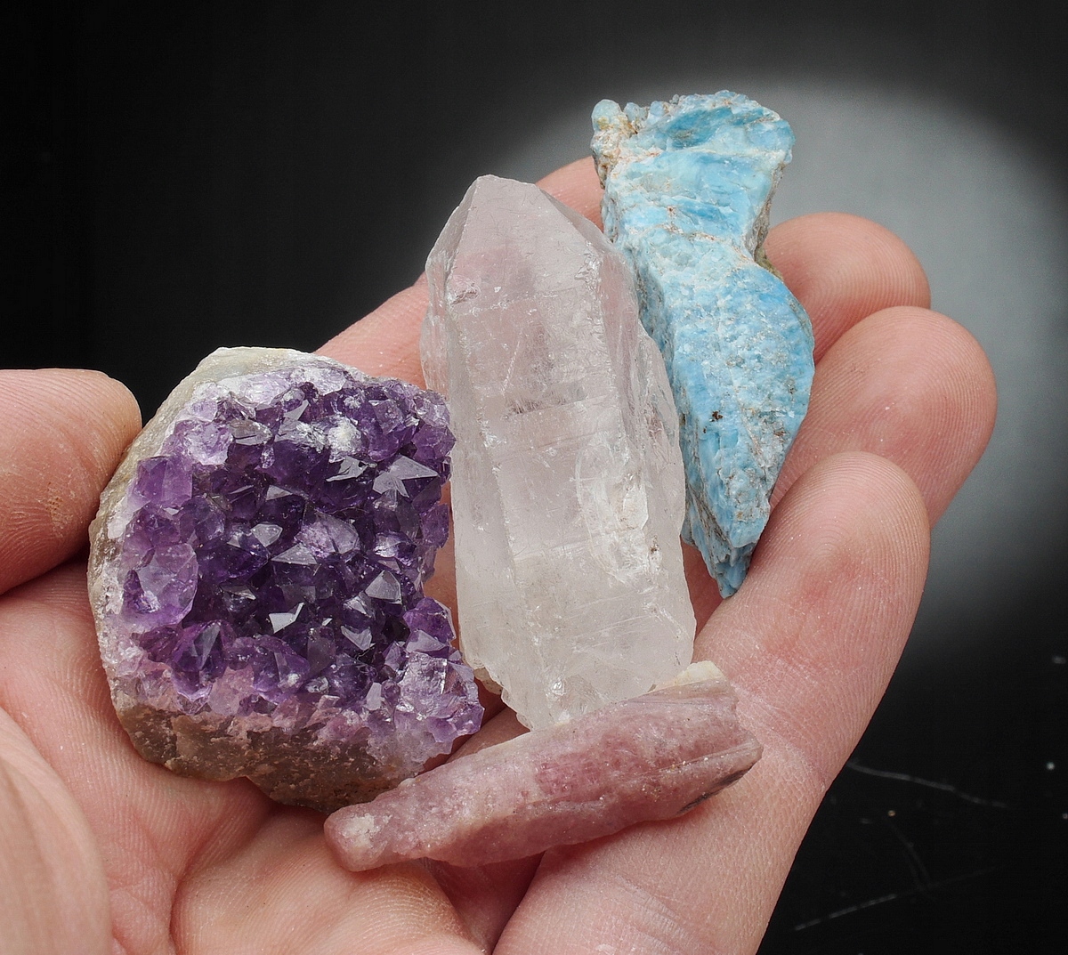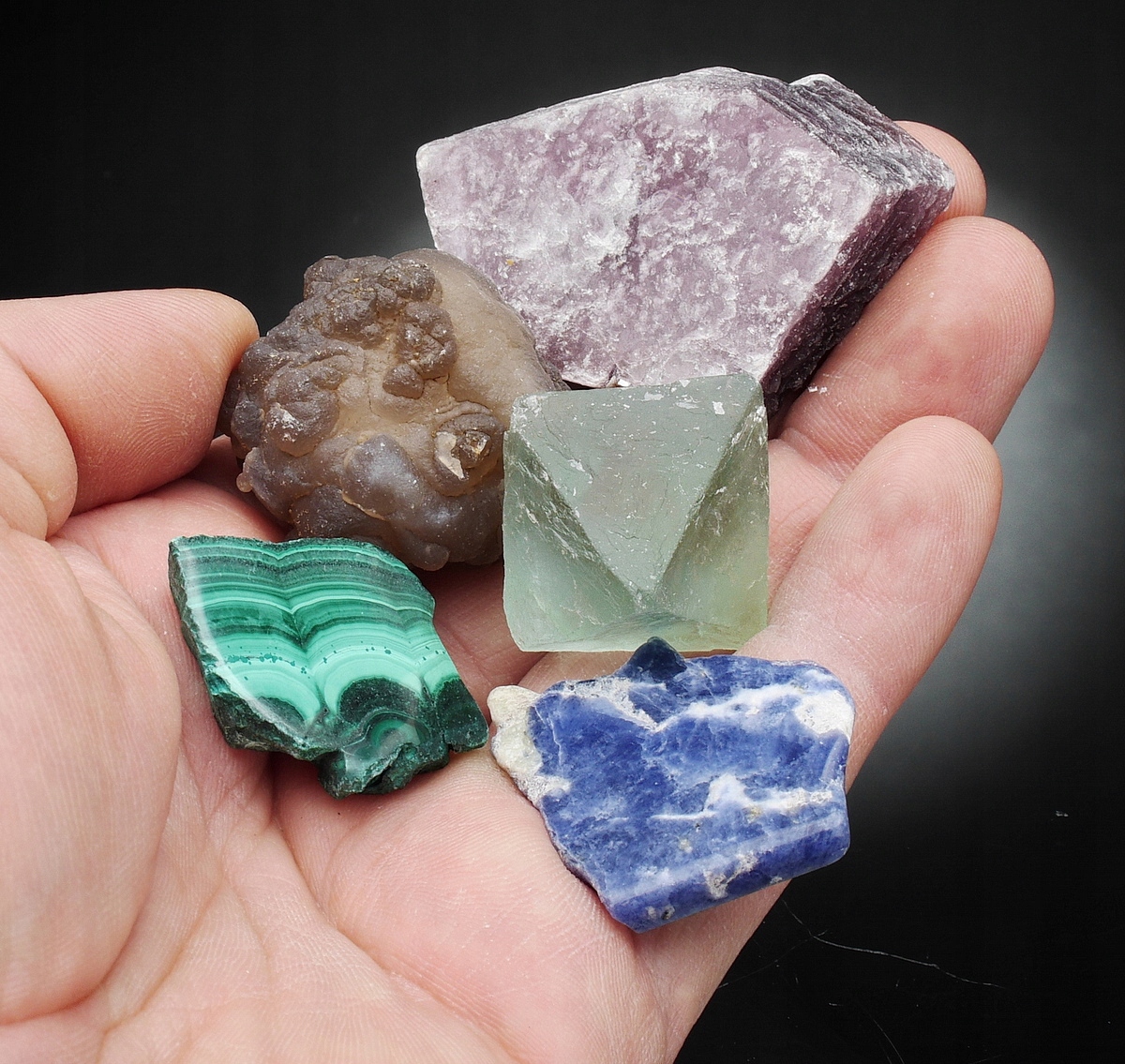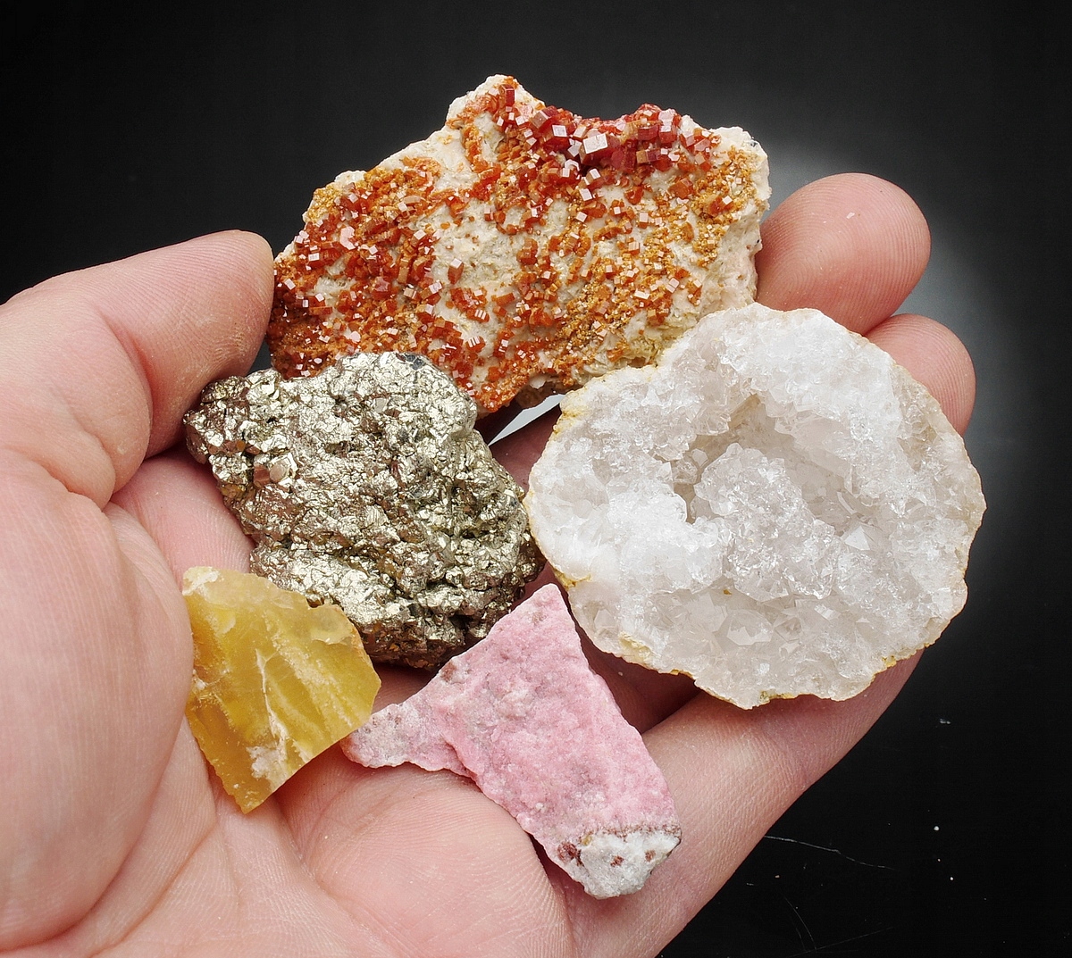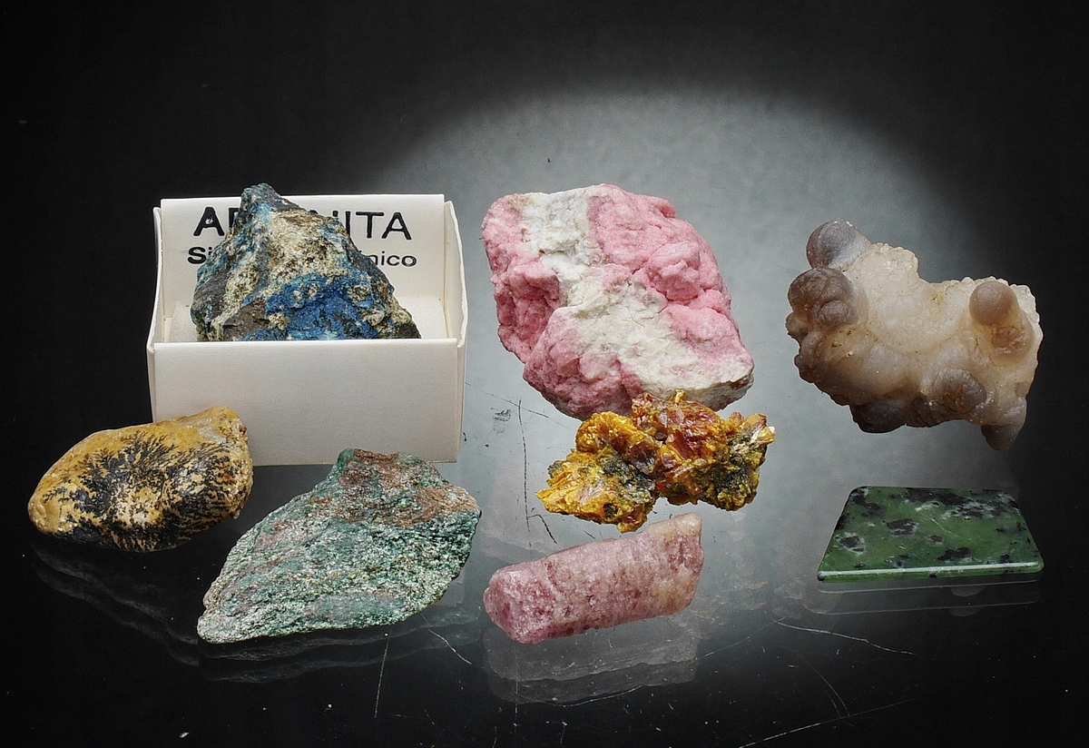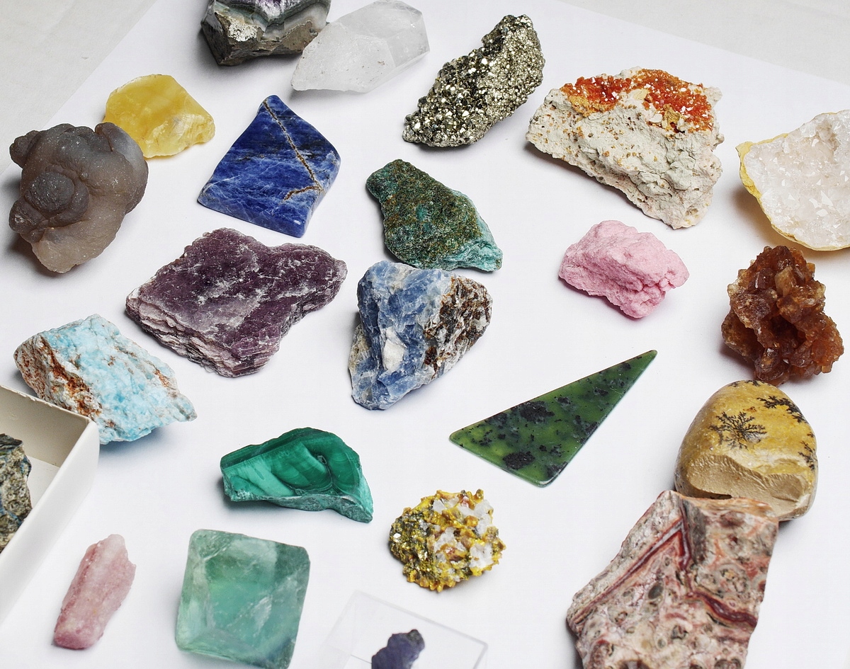 Аметист (Бразилия), кварц жеода (Марокко), пирит (Перу), малахит (Конго), тулит (Норвегия), танзанит (Танзания), флюорит (Китай), ванадинит (Марокко), содалит (Бразилия), горный хрусталь (Бразилия), эринит (Испания), цитрин (Марокко), апатит (Мадагаскар), аурипигмент (Китай), гранат - гроссуляр (Китай), волокнистый гипс (Марокко), медовый опал (Танзания), леопардовая яшма (Мексика), дистен (Бразилия), фуксит (Бразилия), лепидолит (Бразилия), халцедон (Марокко), дендриты марганца (Польша), благородный серпентин (Польша),