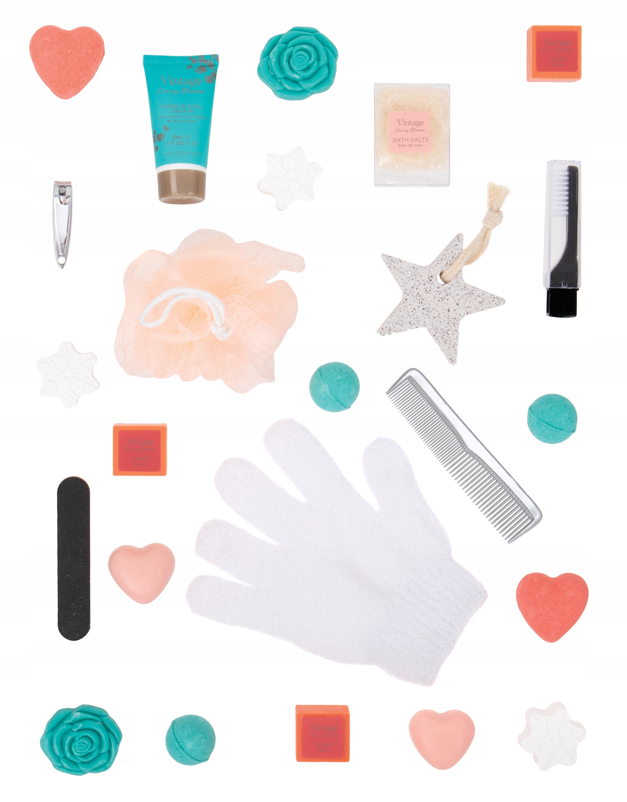 В комплект входят окошки, как в классическом адвент-календаре. Таким образом, вы сможете изо дня в день открывать для себя новые ароматы. Соли для ванн, шарики и мыло позаботятся о вашей коже, обеспечив ей расслабление и отдых после тяжелого дня, а исключительно подобранные ароматы окажут успокаивающее действие на весь организм.