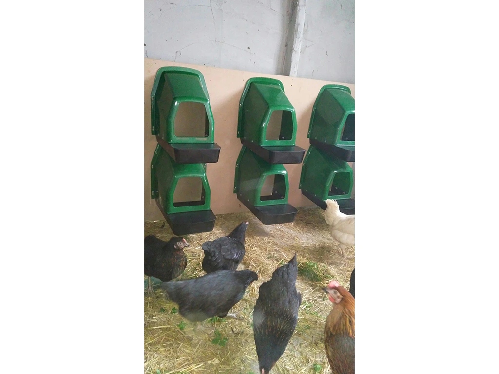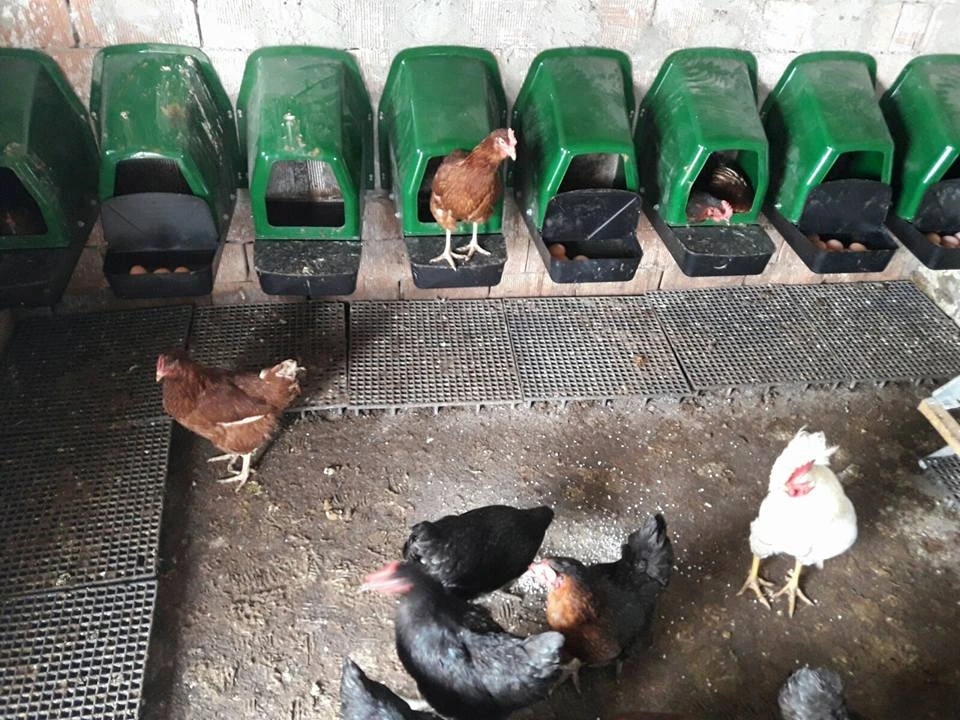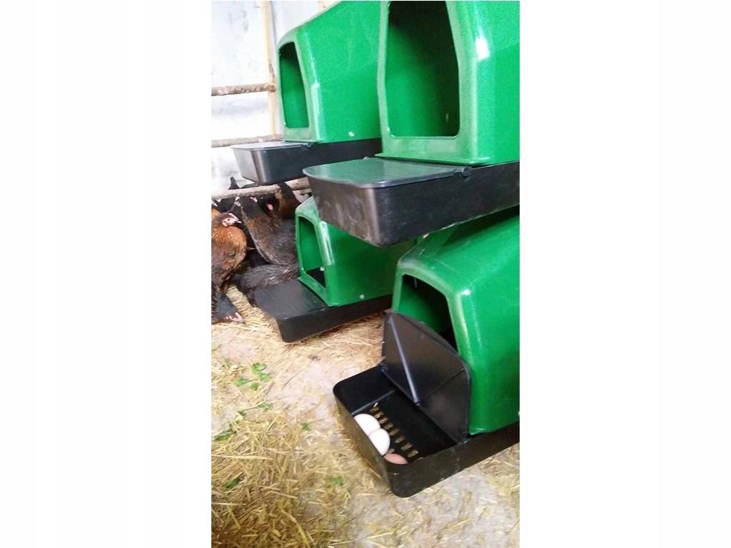 Прибыль для цыплят с коллективной яйцеклетой , емкостью до 5 кур для одной марионетки, нижняя часть гнезда сбрасывается, яйцо ввинчивается в корзину с емкостью до 10 яиц , изготовленного из пластика, зеленого . Легкое прикрепление на стене , очень простое обслуживание чистое, Размеры длиной 44 см (28 см без корзины) x 37 см. Ширина x 50 см Высота .