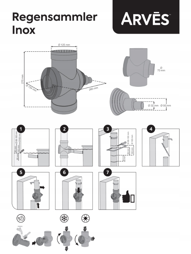 Водосборник изготовлен из материала, устойчивого к погодным условиям и ультрафиолетовому излучению, что обеспечивает длительный срок службы. Он имеет встроенный режим переключения между летом и зимой, что облегчает использование комплекта для сбора дождевой воды без необходимости его демонтажа на зиму.