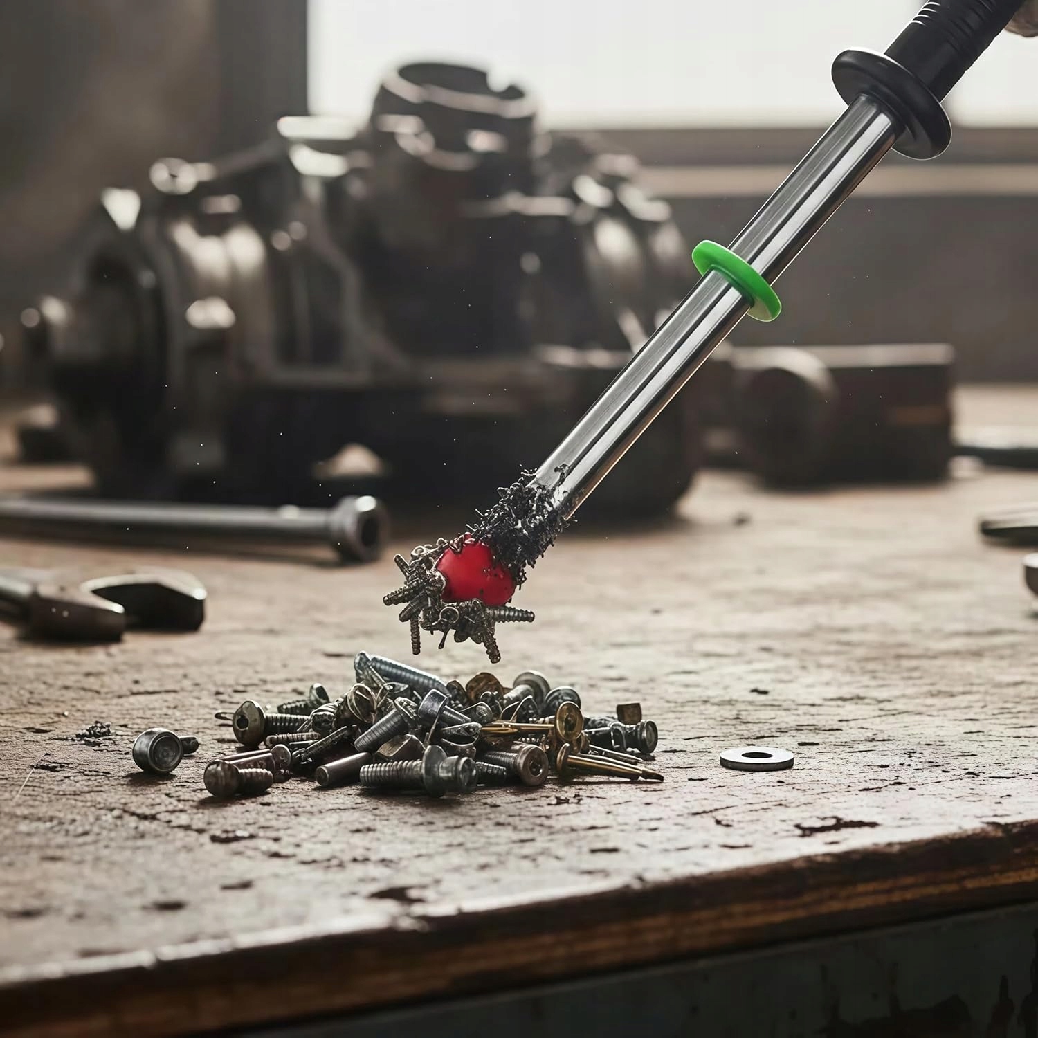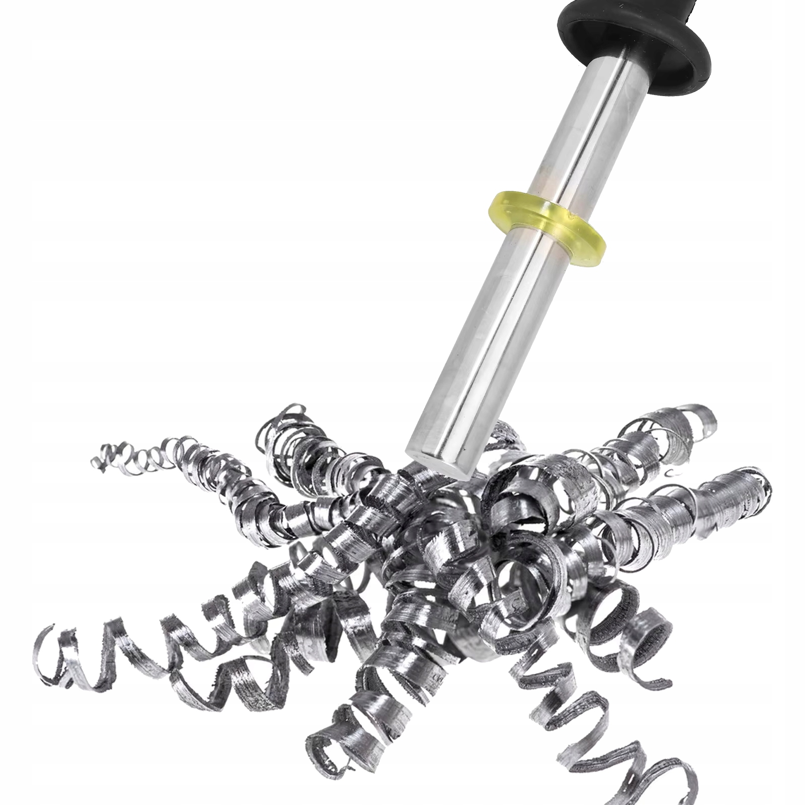 Магнитный коллектор оснащен сильным магнитом, который точно притягивает даже небольшие стальные опилки. Поршневой механизм позволяет быстро высвободить собранные предметы, не прикасаясь к ним рукой. Инструмент не требует питания, что делает его полностью необслуживаемым и готовым к работе в любых условиях.