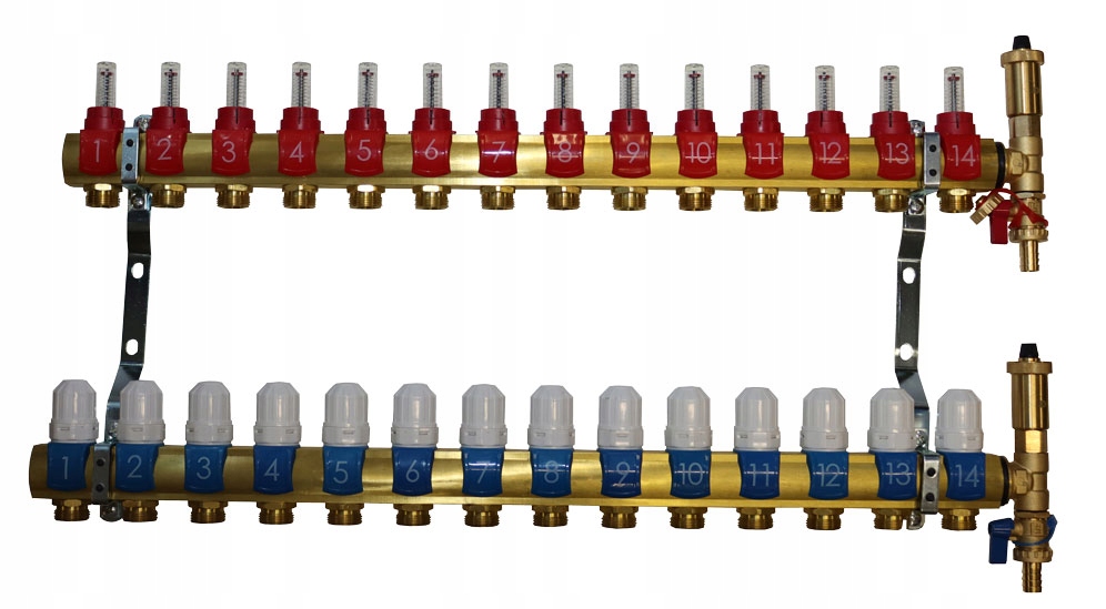 РАСПРЕДЕЛИТЕЛЬ ЛАТУННЫЙ ДЛЯ ПОЛОВОГО ОТОПЛЕНИЯ, 14 СЕКЦИЙ С ТЕРМОСТАТИЧЕСКИМИ КЛАПАНАМИ И РАСХОДОМЕРАМИ