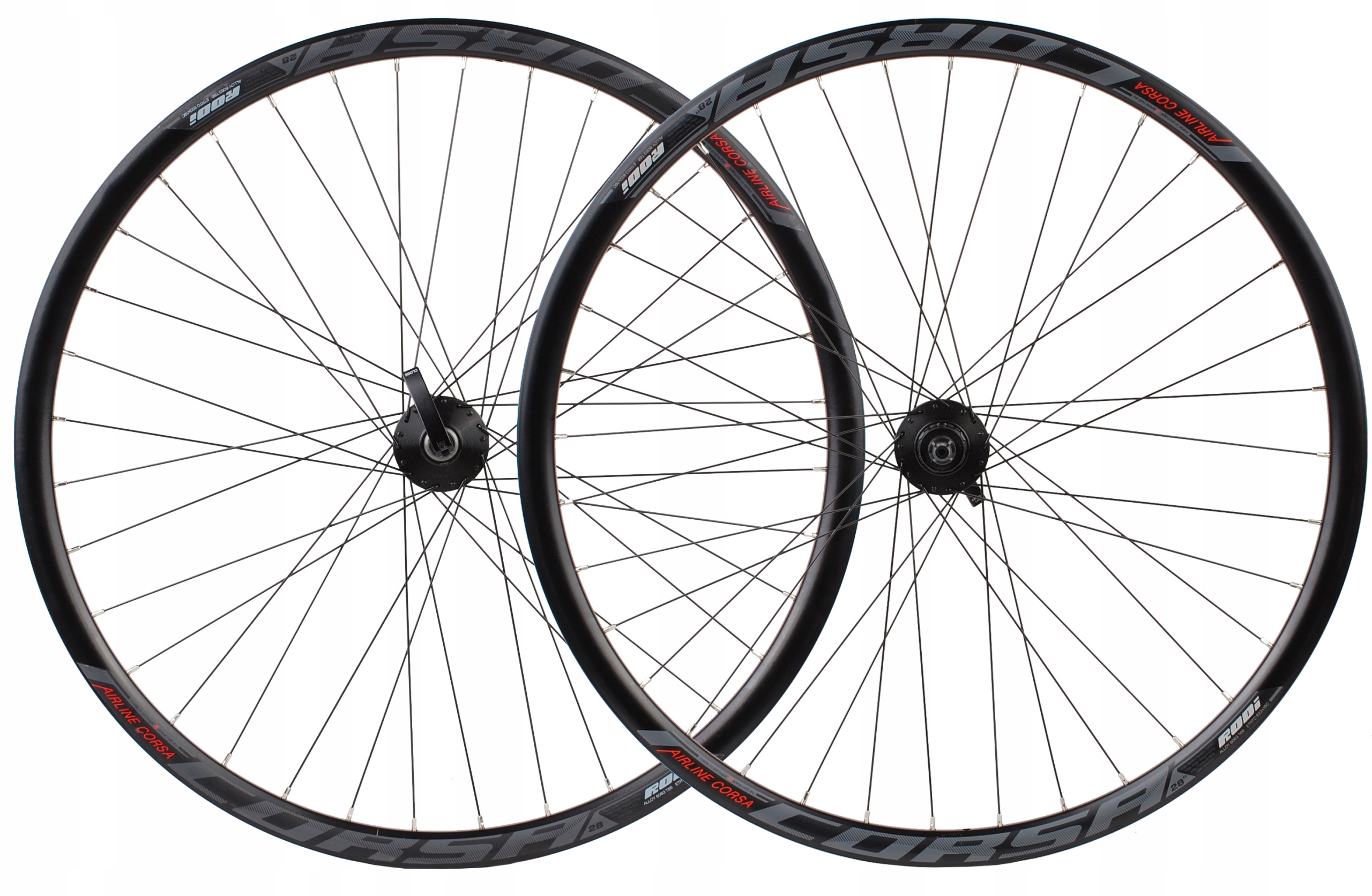 Комплект 28-дюймовых велосипедных колес был создан на усиленном алюминиевом ободе компанией Португальская компания Rodi Airline Corsa. Заднее колесо имеет ступичный барабан, приспособленный для работы с 8/9/10-скоростными кассетами. Ступицы Shimano на шарикоподшипниках с креплением дискового тормоза на 6 болтов, хомуты в комплекте. Латунные ниппели Sapim с 36 оцинкованными спицами.