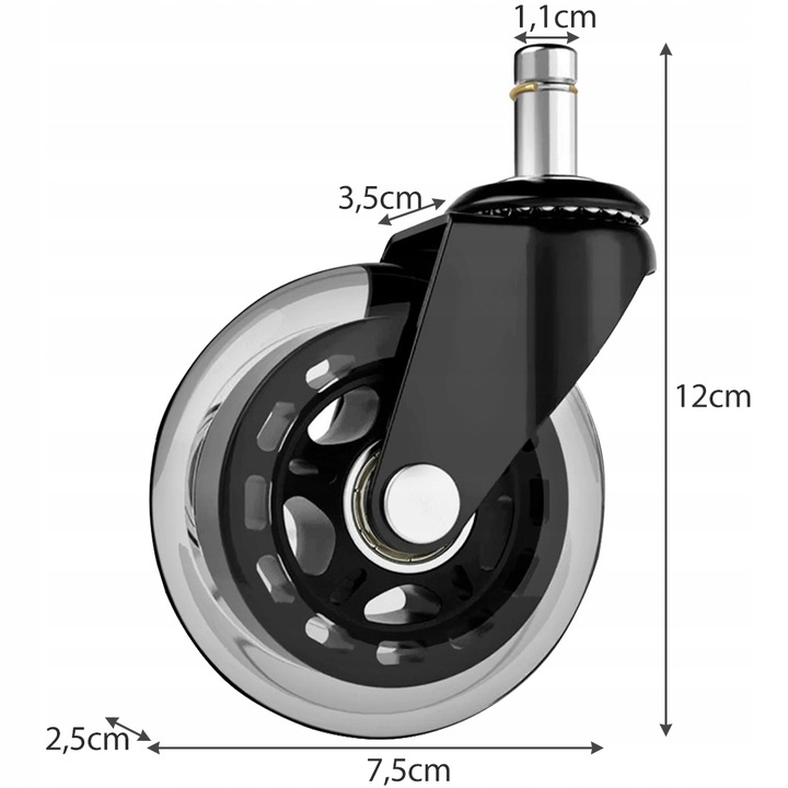 - ТЕХНИЧЕСКИЕ ХАРАКТЕРИСТИКИ - материал: резина/металл; размер хвостовика: 11 х 22 мм; диаметр колеса: 7,5 см; размеры: 12 х 3,5 х 1,1 см; максимальная нагрузка на колесо: 50 кг; масса комплекта: 1040 кг; вес в упаковке: 1,147кг.