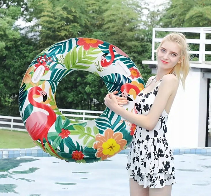 Большое надувное плавательное колесо - мотив фламинго и тропические цветы
