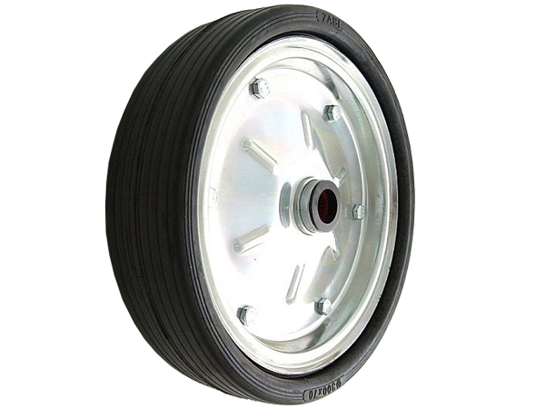 Колесо имеет обод из оцинкованной стали и цельнорезиновую шину.