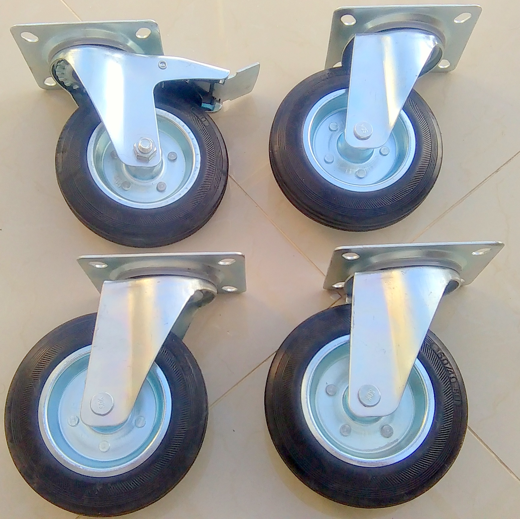 Колеса установлены на так называемых Пластина представляет собой комбинацию вилки из прессованного стального листа, колеса со стальной ступицей и шины из твердой черной резины. Поворотная головка вилки имеет двойные подшипники и защищена от грязи специальным пылезащитным уплотнением. Все металлические элементы комплекта покрыты антикоррозийным хромоцинковым покрытием. Тормоз блокирует колесо и головку.