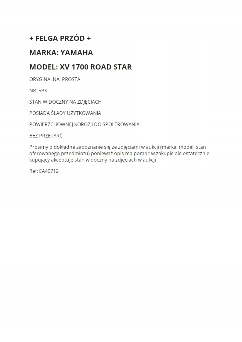 Просматривая «ПЕРЕДНЕЕ КОЛЕСО 5PX YAMAHA XV 1700 ROAD STAR», вы можете быть уверены, что данный товар из каталога «Для мотоциклов и скутеров» будет доставлен из Польши и проверен на целостность. В цене товара, указанной на сайте, учтена доставка из Польши. Внимание!!! Товары для Евросоюза, согласно законодательству стран Евросоюза, могут отличаться упаковкой или наполнением.