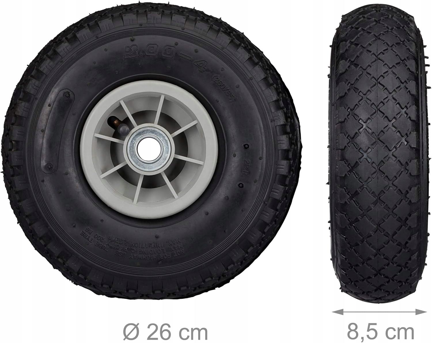 <р> Наши колеса грузоподъемностью до 80 кг справятся с любыми задачами. Пневматические шины отлично работают при давлении 2,5 бар, гарантируя безопасность и комфорт использования. <р> Размеры колес 260 х 85 мм на ударопрочных шарикоподшипниках, что гарантирует их долговечность. Воздушные насосы или компрессоры обеспечат простоту эксплуатации. <р> Длина ступицы 75 мм и диаметр оси 20 мм — дополнительные преимущества, повышающие функциональность этого надежного изделия.Параметры продукта