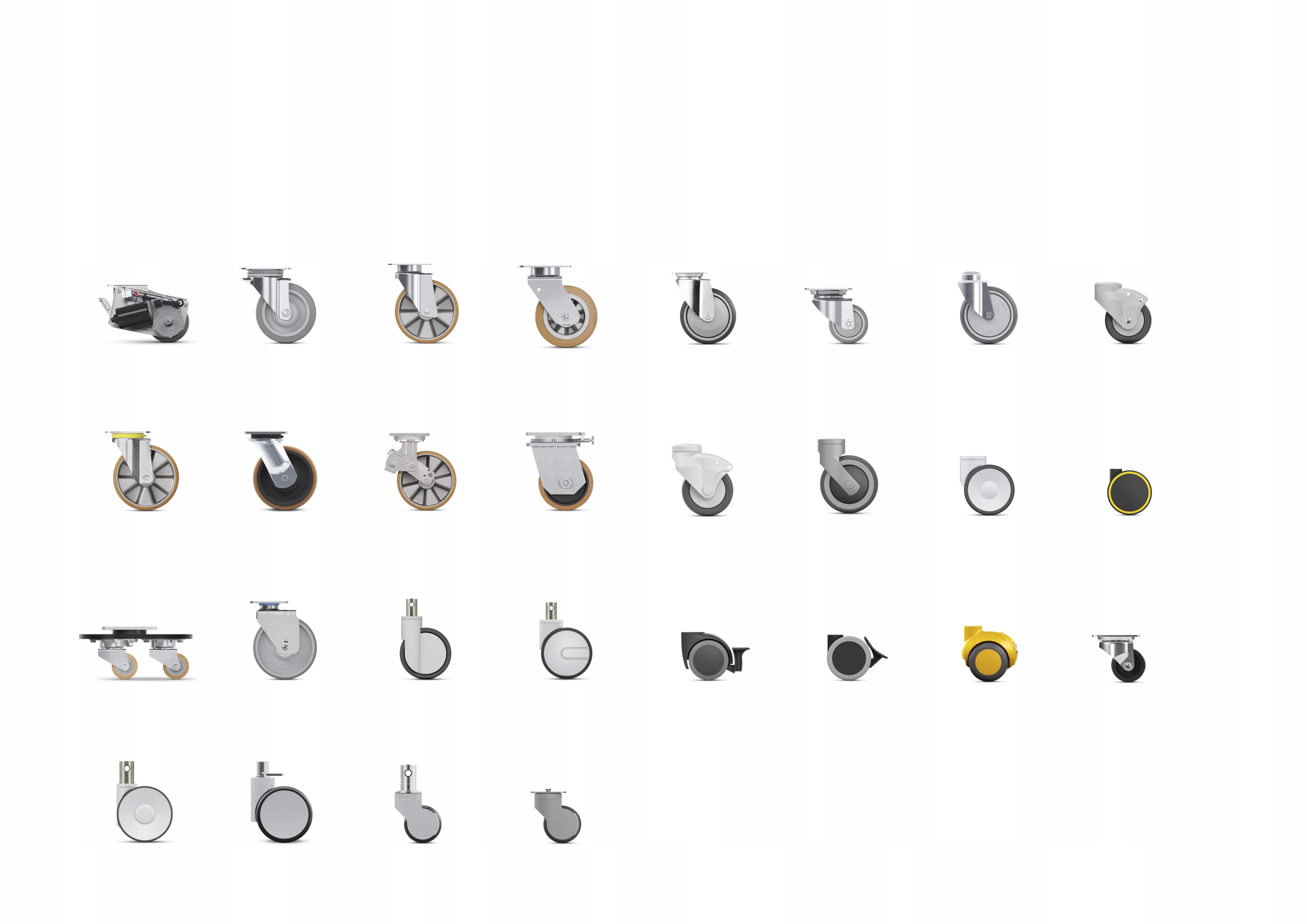 • Колеса с общим тормозом, одновременно блокирующим движение колеса и вращение корпуса, обеспечивающим безопасную парковку автомобиля. тележка или платформа во время разгрузки и погрузки.