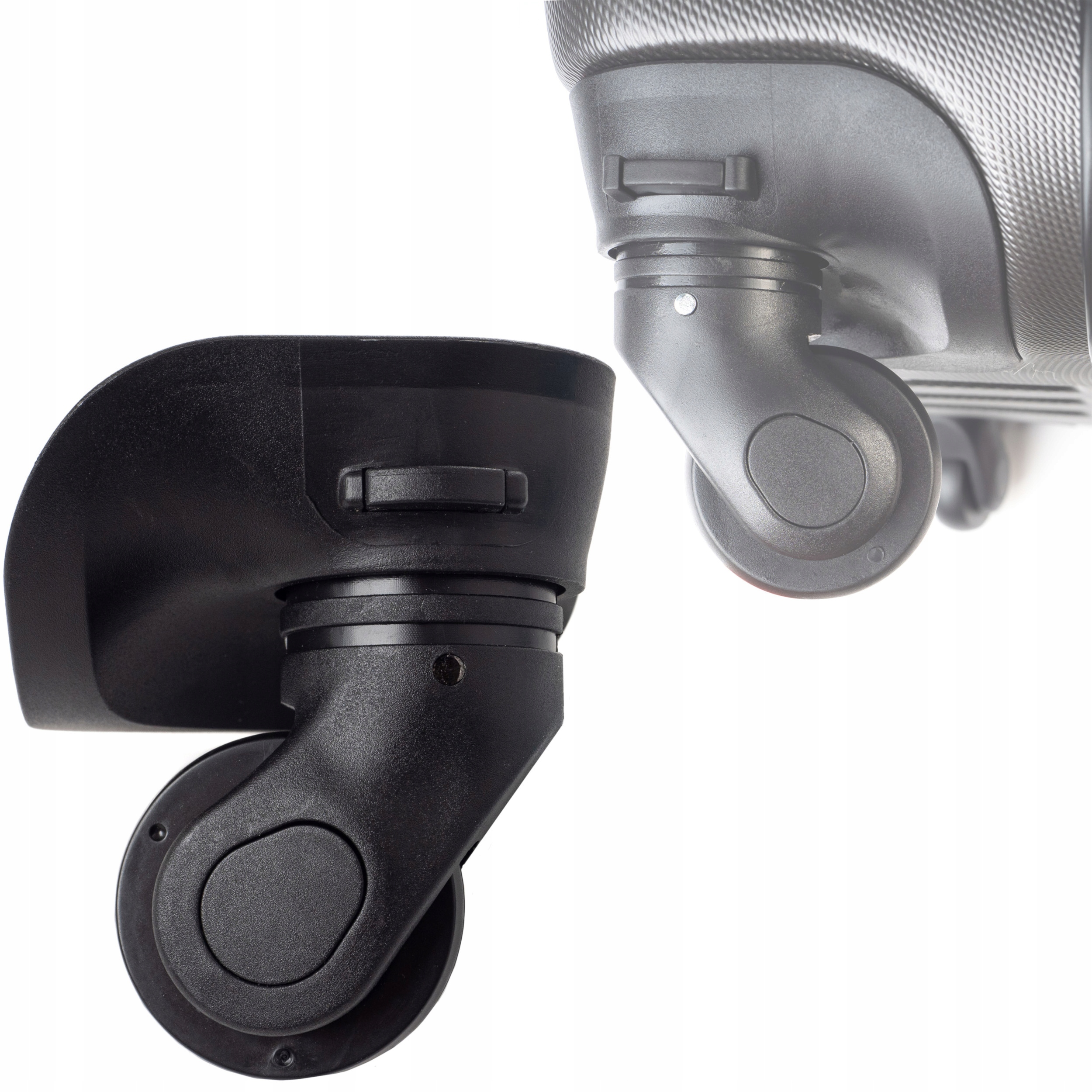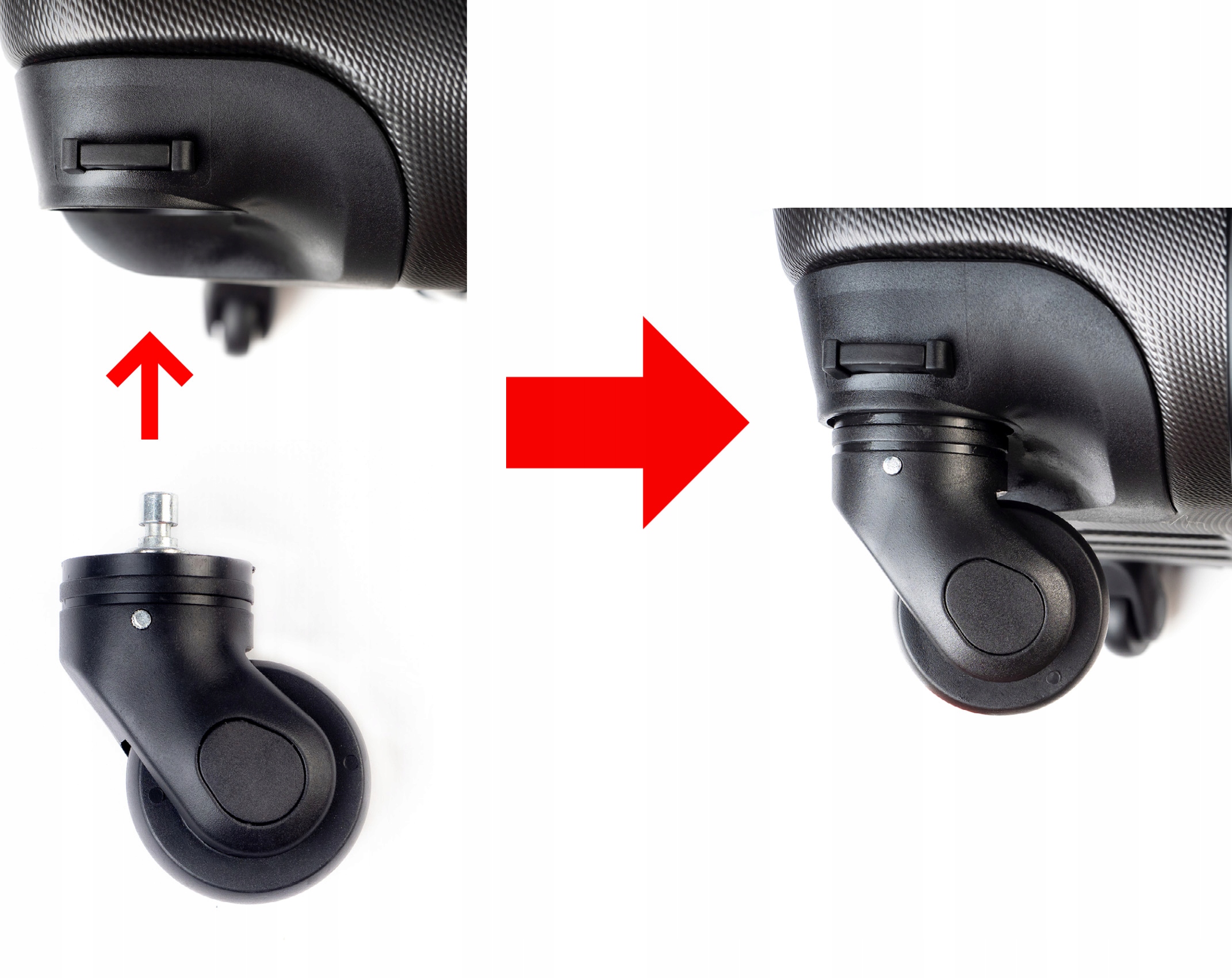 Набор состоит из корпуса колеса (который мы устанавливаем к корпусу чемодана) и резинового колеса.