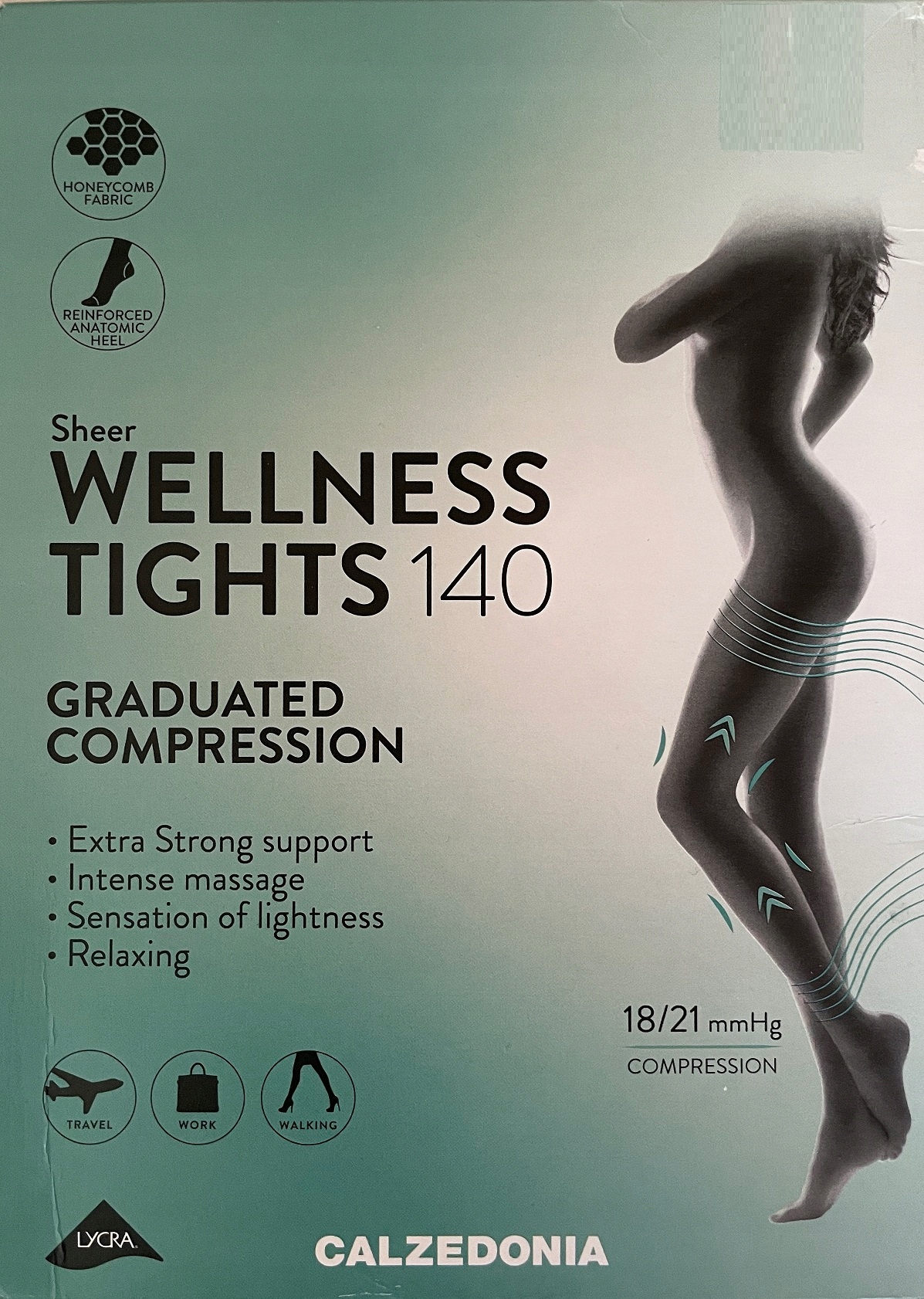 Прозрачные колготки Wellness плотностью 140 ден со ступенчатой компрессией, плотностью 40 ден и усиленным поясом, обеспечивающие сильное давление на ноги: интенсивное и успокаивающий массаж, стимулирующий кровообращение и придающий ногам ощущение легкости и комфорта, с усиленными анатомическими пальцами и пяткой, которые удерживают колготки в правильном положении. Сотовидная строчка, плоские швы и хлопковая ластовица.