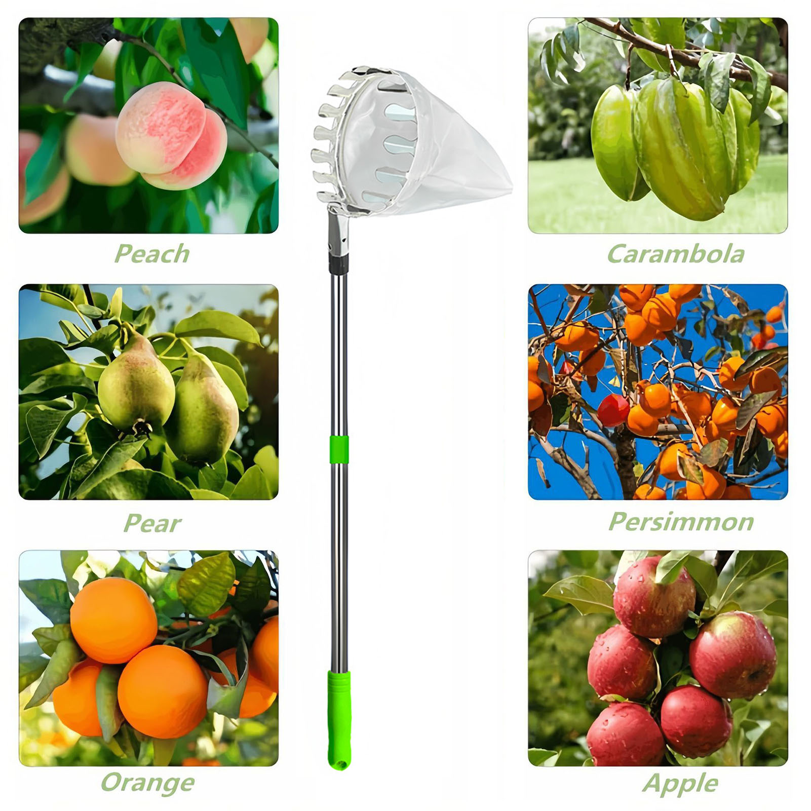 Удобный и эффективный сборщик фруктов с регулируемой длиной, идеально подходит для сбора урожая из фруктовых деревьев в саду или саду. Оборудован металлической корзиной и сумкой для фруктов - облегчает безопасное и быстрое сбор фруктов без использования лестницы.
