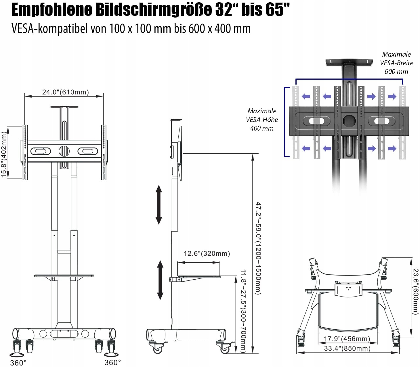 Простота сборки и удобство в использовании — совместимость с экранами от 32 до 65 дюймов с максимальными монтажными отверстиями VESA 600 x 400. Будь то холл отеля, выставка, видеоконференция или просто дома — быстро и легко установить собрать.
