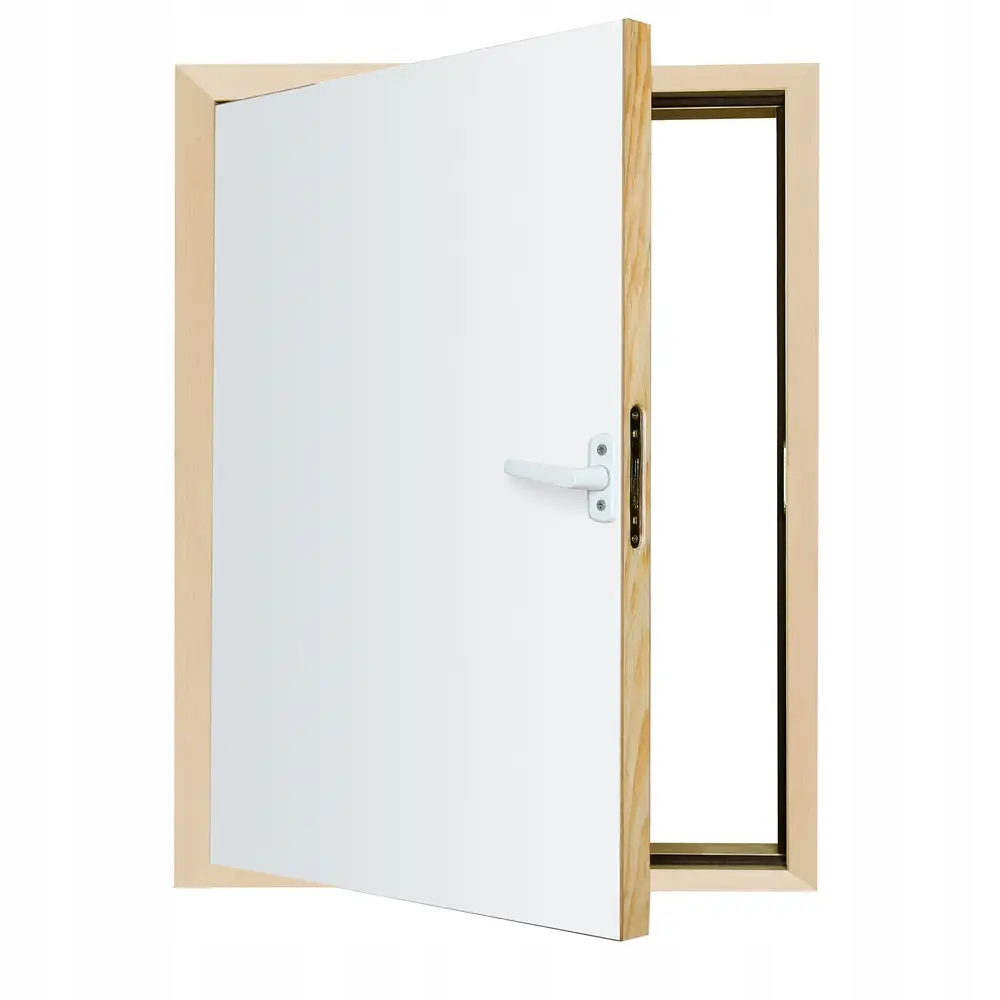 Коленные двери FAKRO DWK предназначены для установки в коленную стену. Они обеспечивают доступ в непригодное для использования помещение, расположенное за коленной стеной. Их можно установить в версии, открывающейся в правую или левую сторону. В стандартной комплектации коленные двери оснащены отделочными планками натурального цвета шириной 3,5 см. Дверное полотно толщиной 3,6 см изготовлено из деревянного каркаса, облицованного с обеих сторон белой плитой ХДФ, внутри заполнено теплоизоляционным материалом.