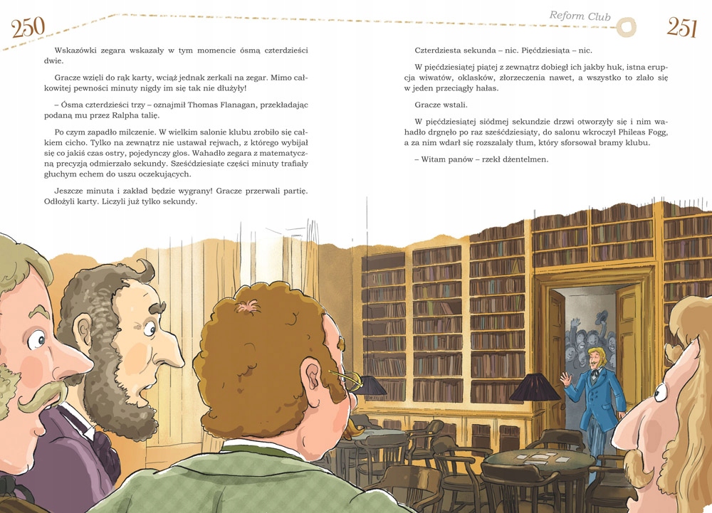 Вокруг света за 80 дней Жюля Верна — классика литературы. Книга находится в списке чтения, поэтому неудивительно, что в Польше так много изданий. Это приключенческий роман, в котором главную роль играют путешествия. Разнообразные его формы могут удивить читателя — поезда, лодки и даже слоны придают кругосветной экспедиции множество оттенков. Поскольку на дворе конец 19 века, герой не может путешествовать другим способом, что тоже довольно интересно в этой книге - показано, как люди, собиравшиеся в далекие страны, передвигались в прошлом и сколько длилось их путешествие (.. .) Роман насыщен действием, в удивительных сценах нет недостатка. Всегда что-то происходит. Читателю не скучно ни на минуту. Рассказ читается быстро. В нем много слов, которые юный читатель может не понять, поэтому они пояснены в сносках. Все это дополнено красочными иллюстрациями Николая Камлера (...) Грег издал ее очень хорошо, книга с иллюстрациями радует глаз. Недостатки стоит компенсировать.
