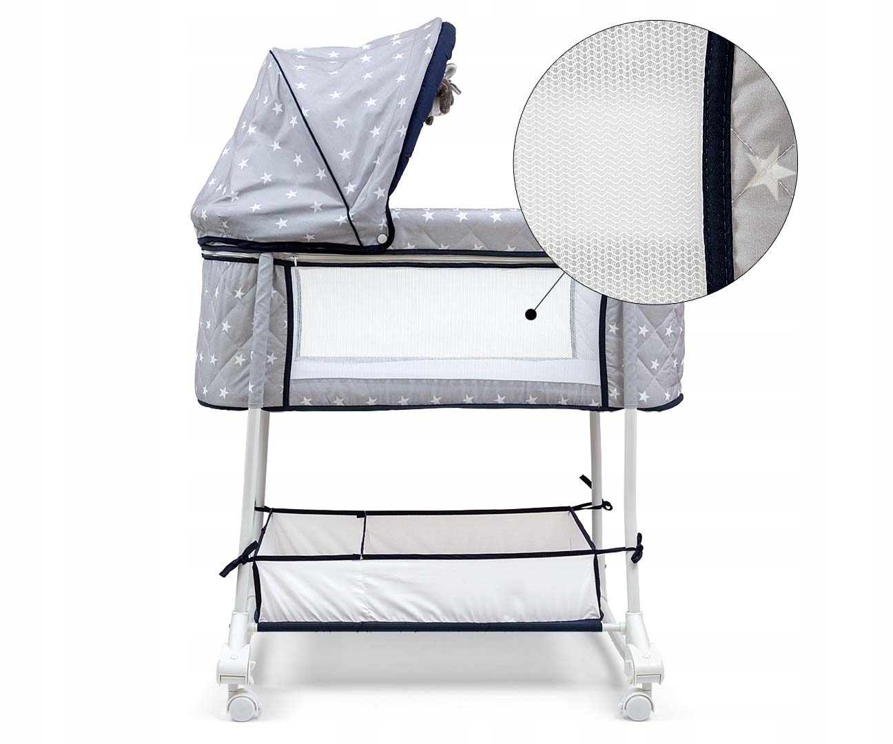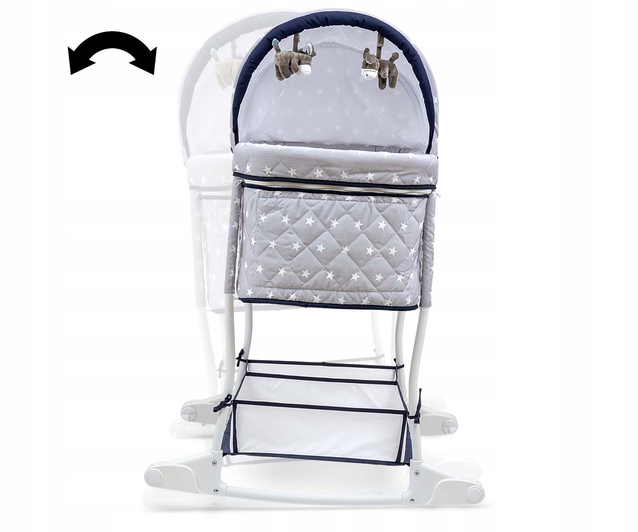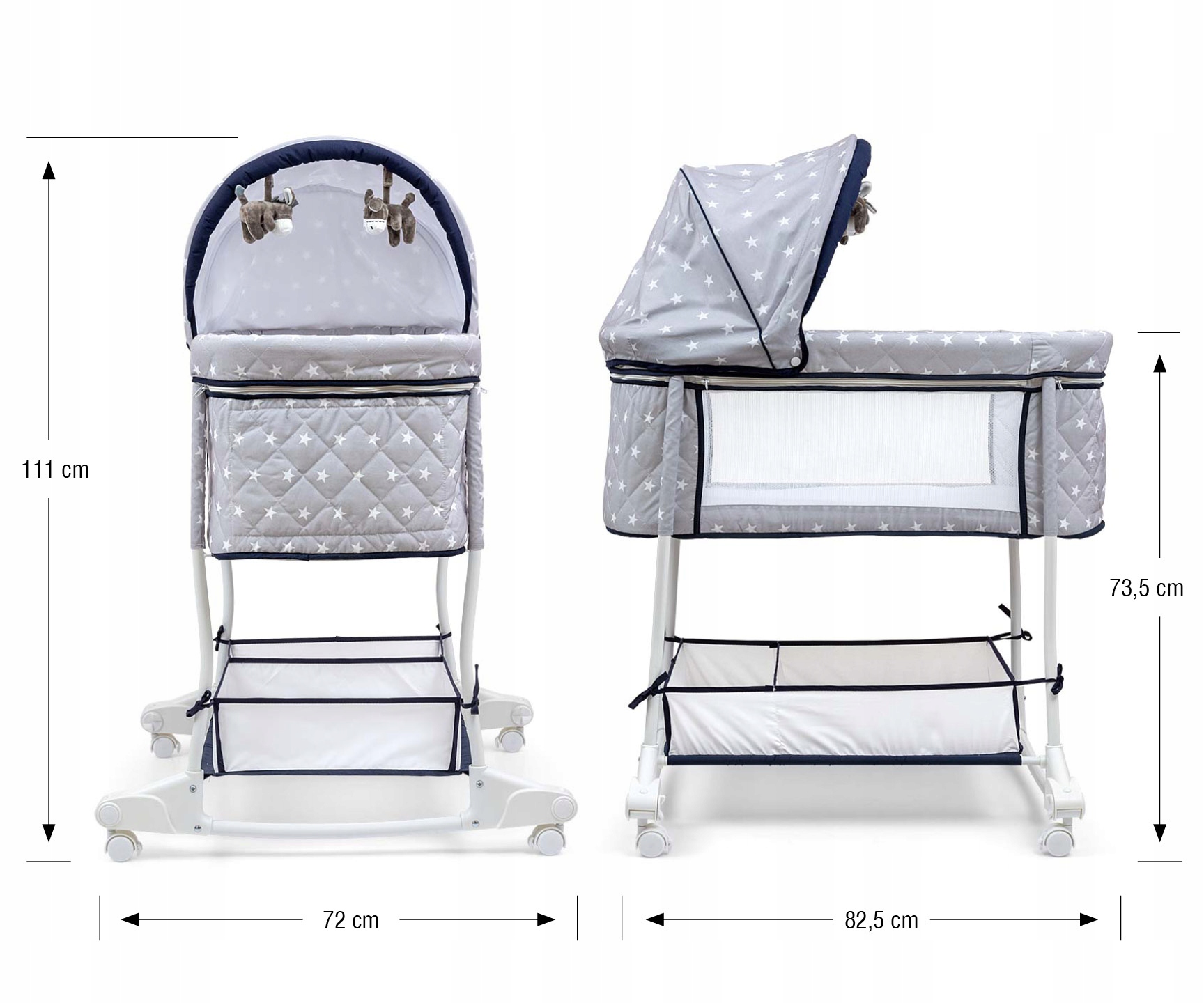 Колыбелька – первая кроватка оснащена практичным отделением для хранения вещей – корзина для посуды и аксессуаров малыша, размещенная внизу, имеет 2 отделения.