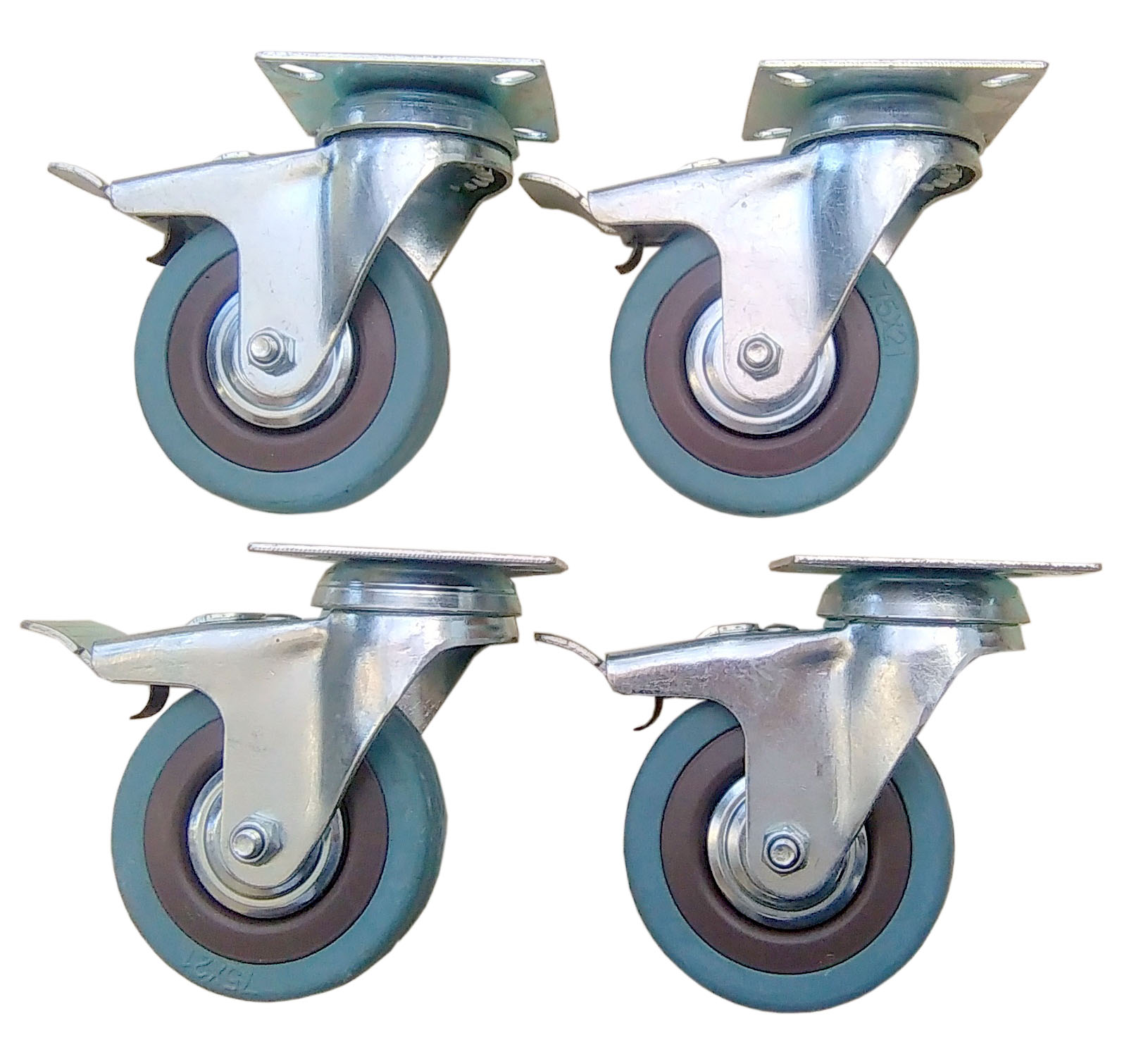 Колеса установлены на так называемых Пластина представляет собой комбинацию рабочей вилки из штампованного стального листа и колеса с полипропиленовой ступицей и шиной из серой немаркой резины. Поворотная головка вилки имеет двойные подшипники. Все металлические элементы комплекта покрыты антикоррозийным хромоцинковым покрытием. Тормоз блокирует колесо и головку.