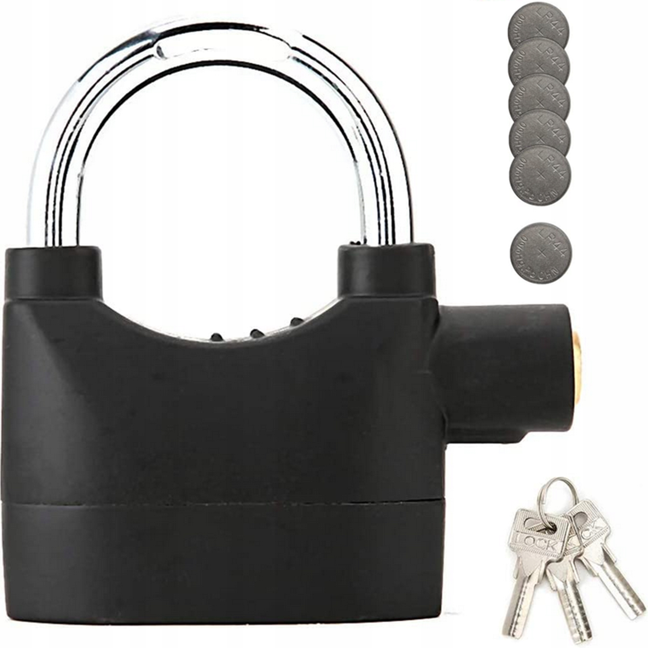 Звуковой сигнал и датчик движения питаются от шести батареек LR44, которые идут в комплекте с навесным замком.