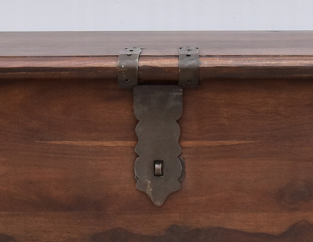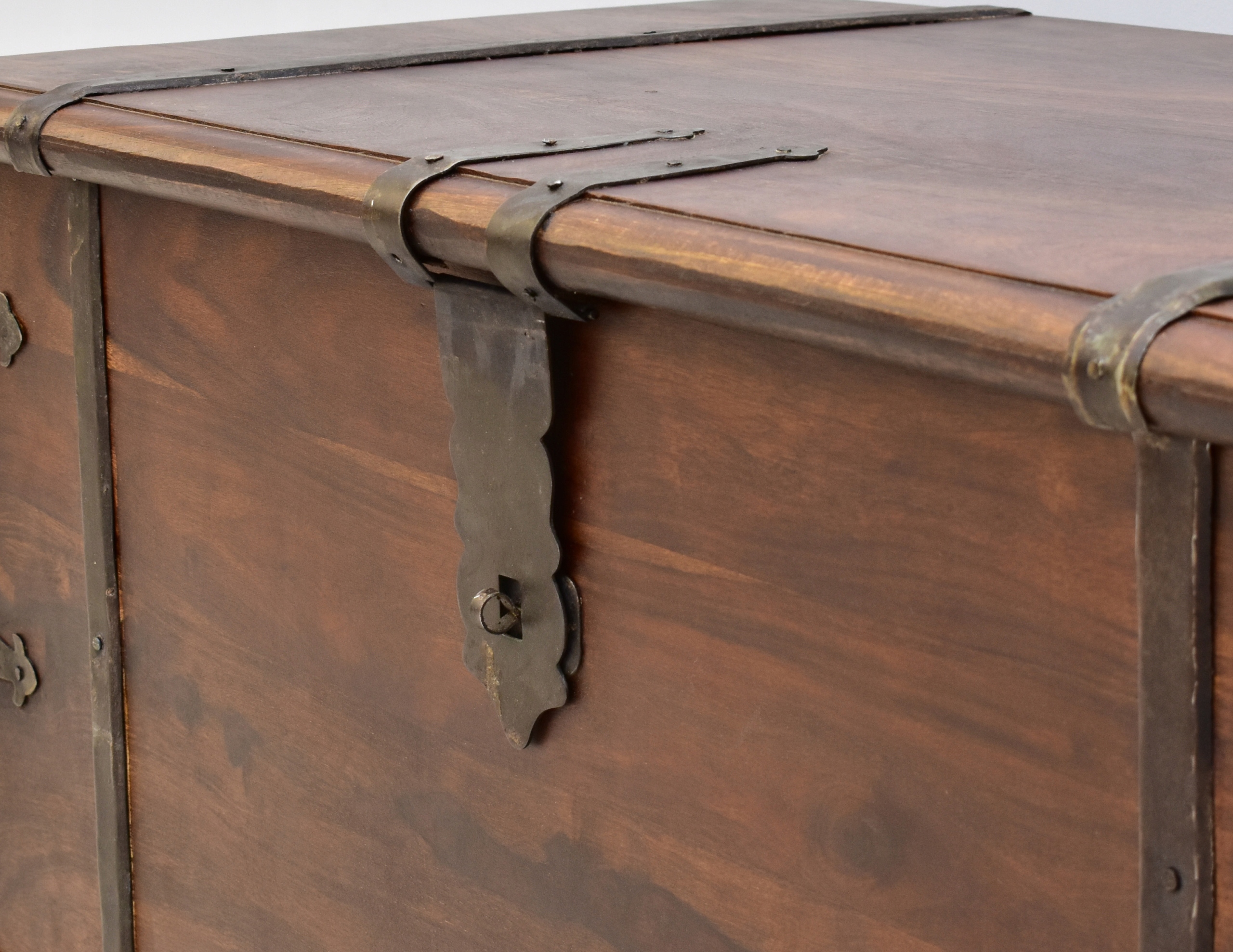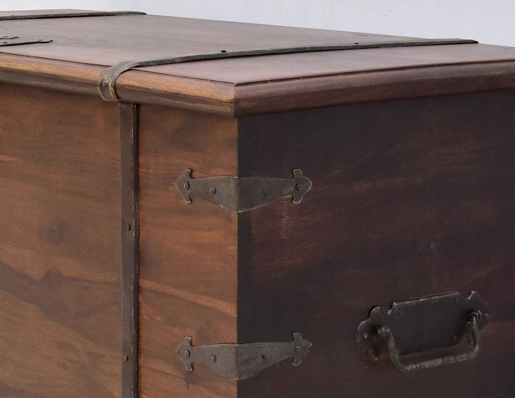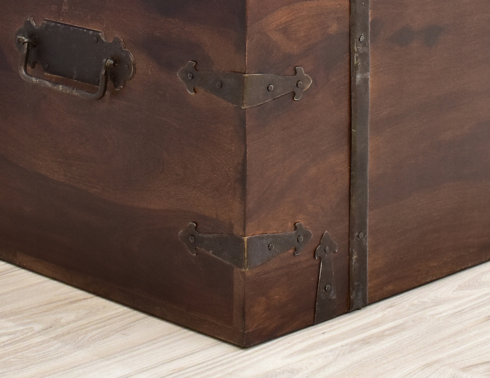 Темно-коричневый сундук в колониальном стиле с металлической фурнитурой. Это сундук размером 100/50/50 см, изготовленный из 100% массива индийского палисандра. Этот индийский предмет мебели идеально подходит для хранения самых разных вещей. Поэтому это может быть идеальная обувница в прихожей, уникальный ящик для постельного белья в спальне или экзотический функциональный акцент в гостиной.