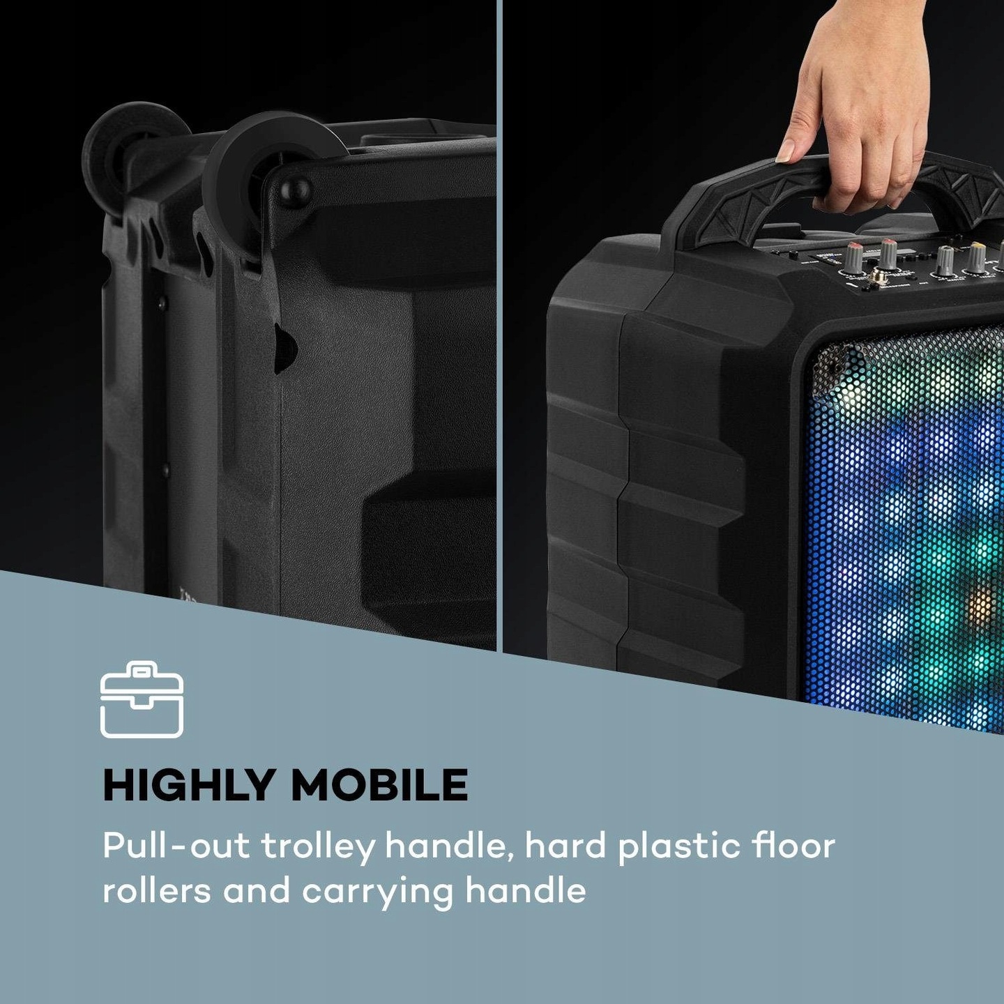 Беспроводной УВЧ-микрофон караоке-машины — Auna Moving 80.1 LED позволяет вам правильно настроиться на следующую караоке-вечеринку или напрямую представить свои собственные песни. Благодаря независимой работе оборудования вы можете слушать музыку дома, в саду, в парке, на пляже или где угодно. Встроенный аккумулятор 4,5 А/12 В с индикатором уровня заряда работает до 5 часов полностью независимо от электросети, а также может черпать новую энергию от автомобильного аккумулятора напряжением 12 В. Компактный корпус, съемная ручка, две жесткие пластиковые колеса и ручка для переноски позволяют легко перемещать Moving 80.1 LED куда угодно.