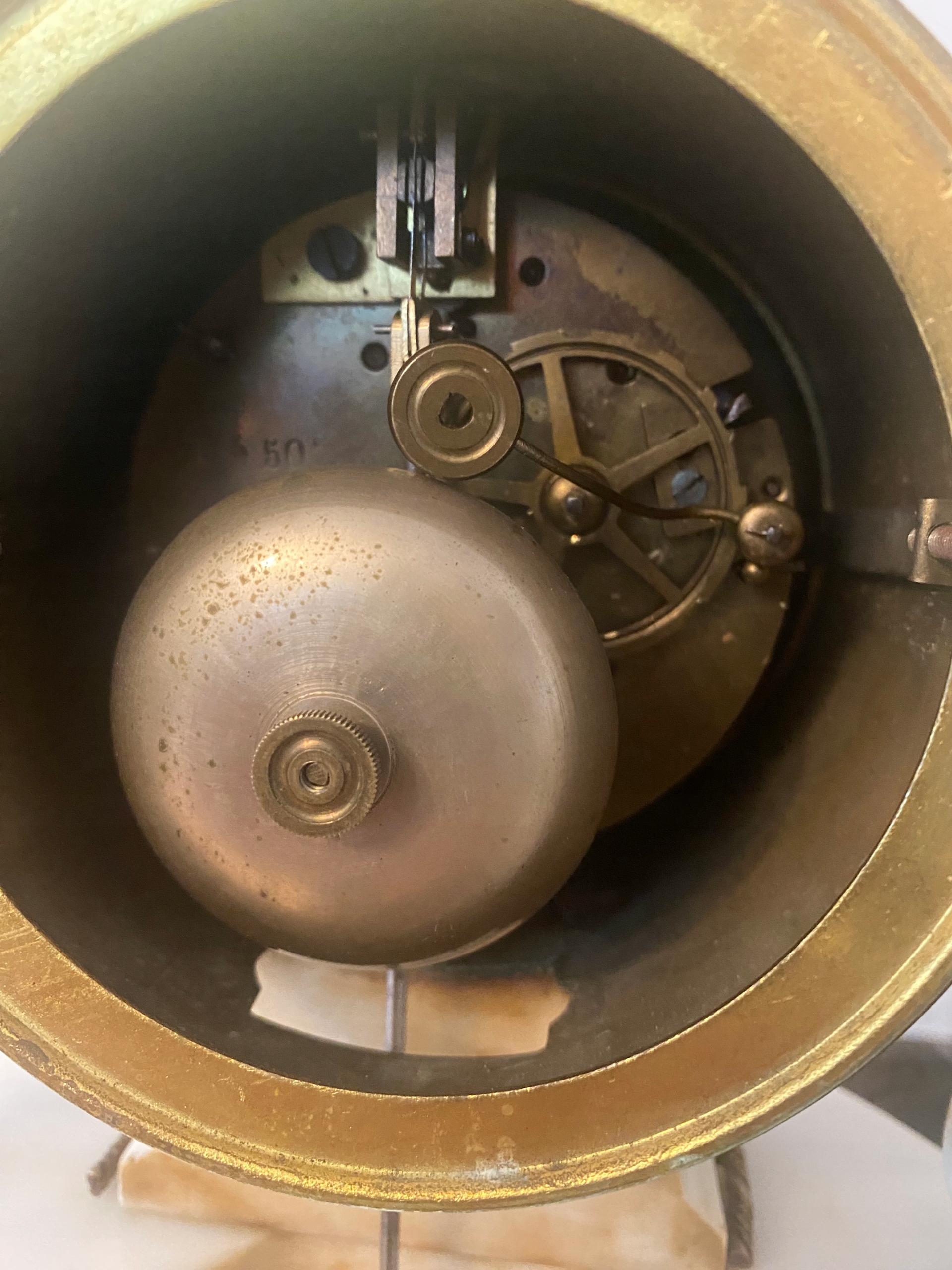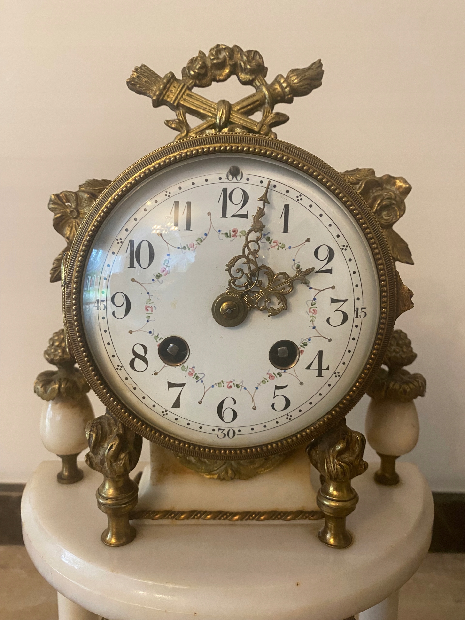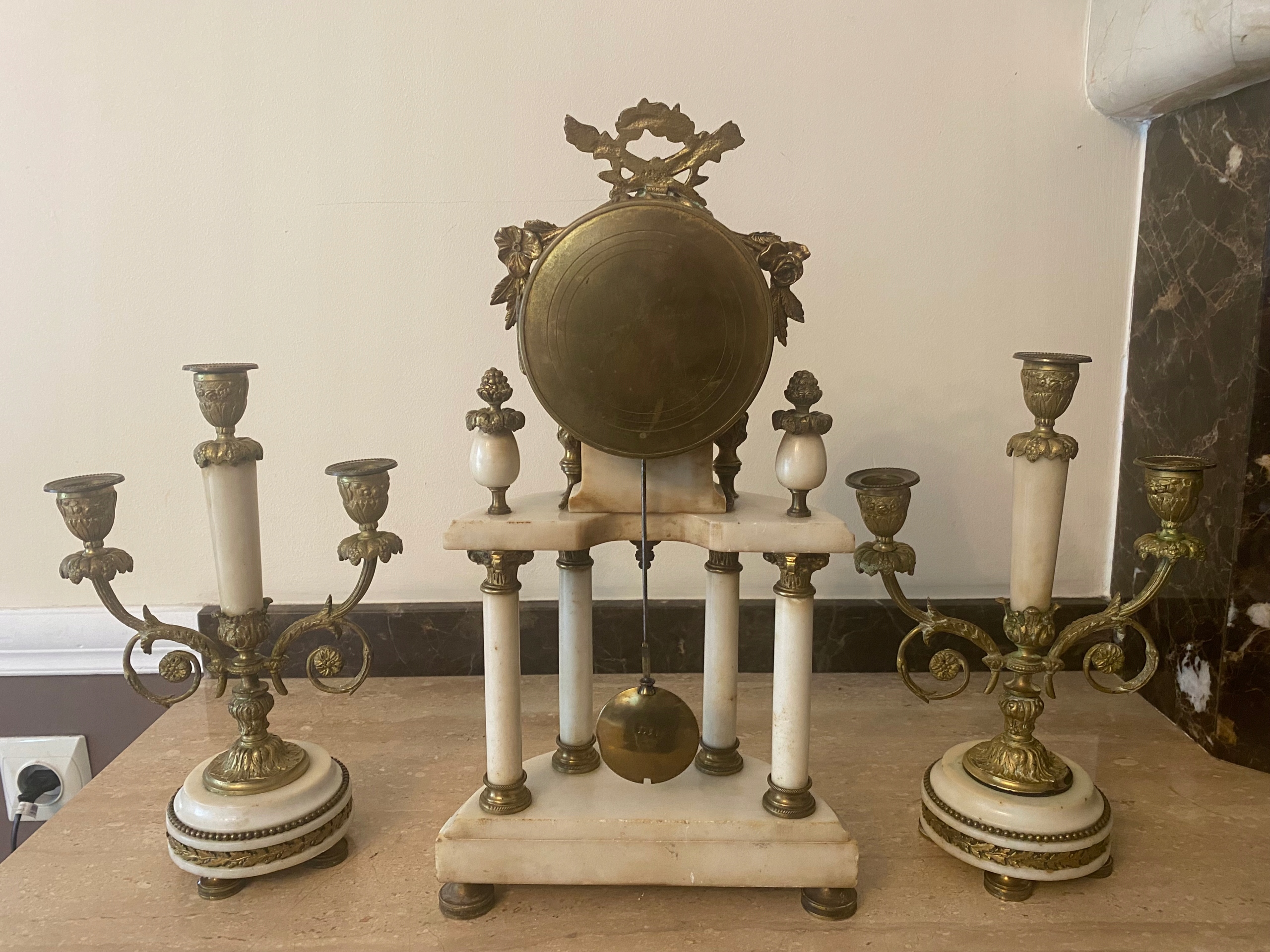 Часы выполнены из мрамора с бронзовой фурнитурой.