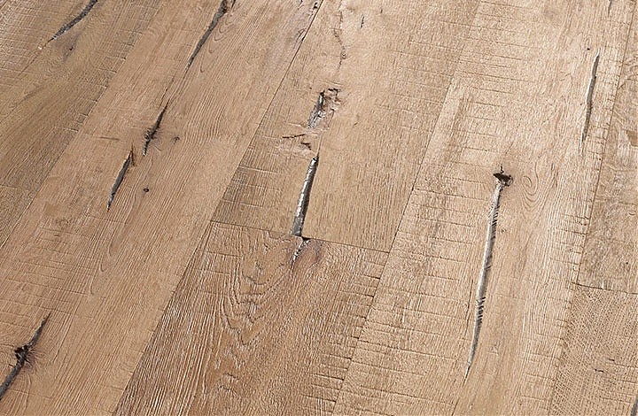 ДУБ КОЛОРАДО СИТИ из коллекции КЕНТУККИ — одноламельная доска, очень рустикальная. Копчёный, брашированный, потёртый добела, с видимыми трещинами, промасленный. Снятие фасок происходит на всех краях.
