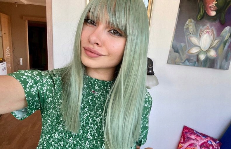 ⭐ Яркий парик — зеленые волосы, длинные мятные волосы с прямой челкой.