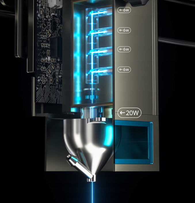 Основываясь на технологии сжатия и формирования пятна, четыре лазерных диода мощностью 6 Вт соединены с оптическими зеркалами для увеличения мощности лазера до 20 Вт, что позволяет сжимать пятно до размера 0,08 мм * 0,1 мм.