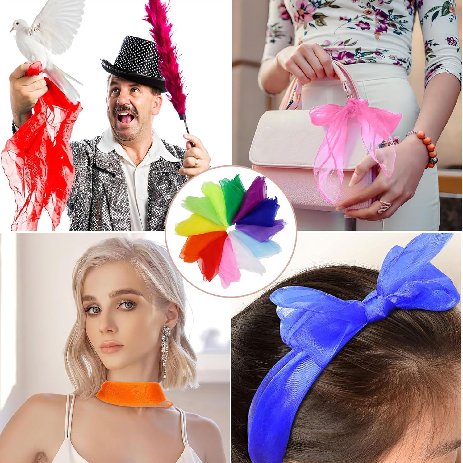 - - В комплект входят 12 квадратных платков разных цветов (белый, темно-оранжевый, розовый, светло-фиолетовый, флуоресцентно-зеленый, темно-синий, темно-зеленый, ярко-красный, благородный синий, светло-желтый, темно-фиолетовый, изумрудно-зеленый). Цвета яркие и яркие, поэтому вы можете выбрать цвет, подходящий к вашему наряду.