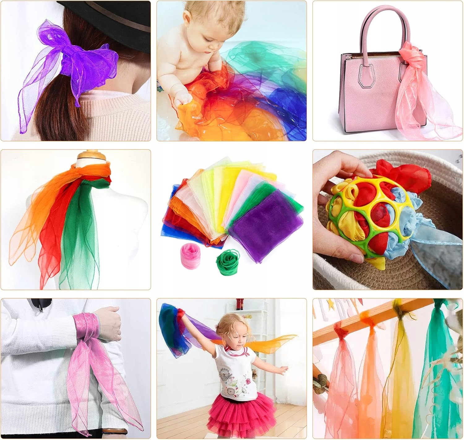 ✳️✳️Поощряйте детей.Использование шифоновых тканей для взаимодействия с детьми посредством ритма и движений не только стимулирует их чувства, но также улучшает их ловкость и творческие способности, а также стимулирует их чувства к игре. Ткани для жонглирования идеально подходят для сенсорных игр с детьми.