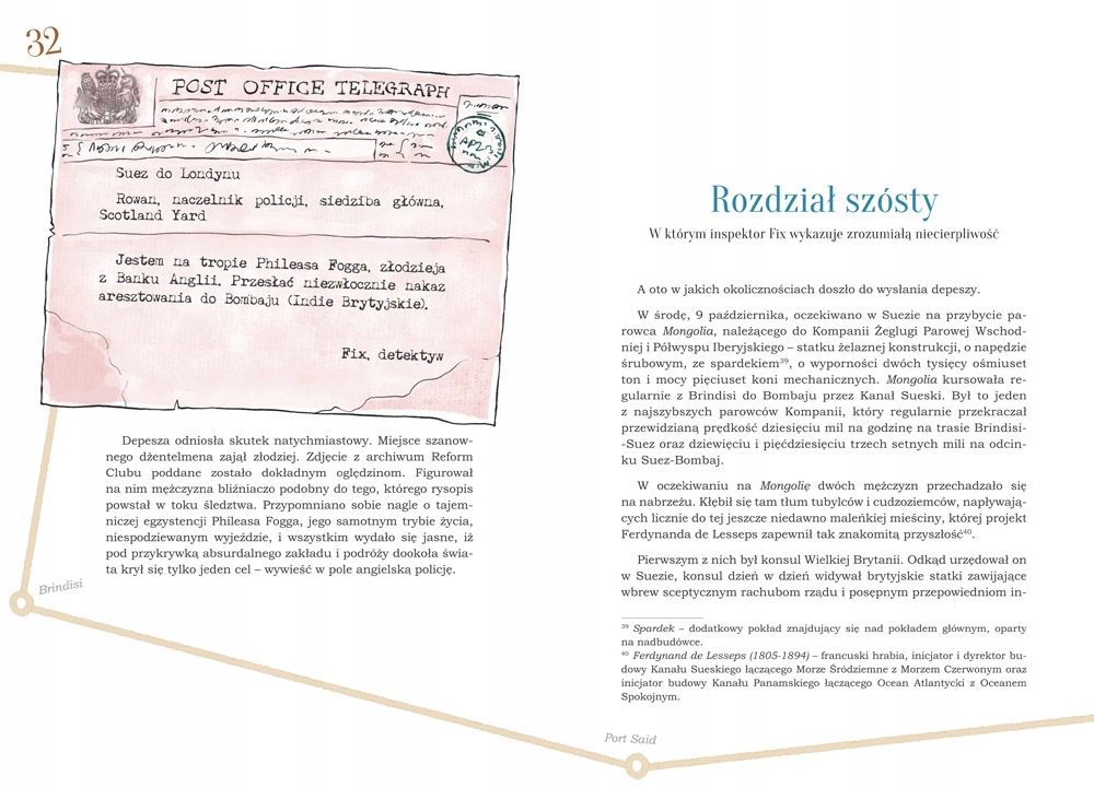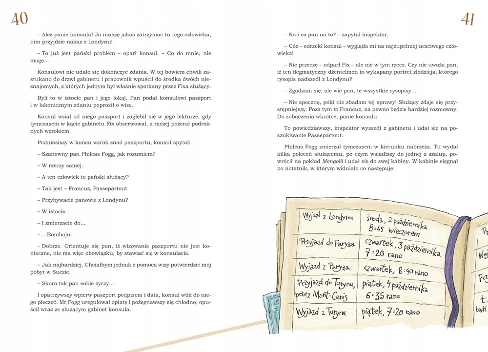 Вокруг света за 80 дней Жюля Верна — классика литературы. Книга находится в списке чтения, поэтому неудивительно, что в Польше так много изданий. Это приключенческий роман, в котором главную роль играют путешествия. Разнообразные его формы могут удивить читателя — поезда, лодки и даже слоны придают кругосветной экспедиции множество оттенков. Поскольку на дворе конец 19 века, герой не может путешествовать другим способом, что тоже довольно интересно в этой книге - показано, как люди, собиравшиеся в далекие страны, передвигались в прошлом и сколько длилось их путешествие (.. .) Роман насыщен действием, в удивительных сценах нет недостатка. Всегда что-то происходит. Читателю не скучно ни на минуту. Рассказ читается быстро. В нем много слов, которые юный читатель может не понять, поэтому они пояснены в сносках. Все это дополнено красочными иллюстрациями Николая Камлера (...) Грег издал ее очень хорошо, книга с иллюстрациями радует глаз. Недостатки стоит компенсировать.