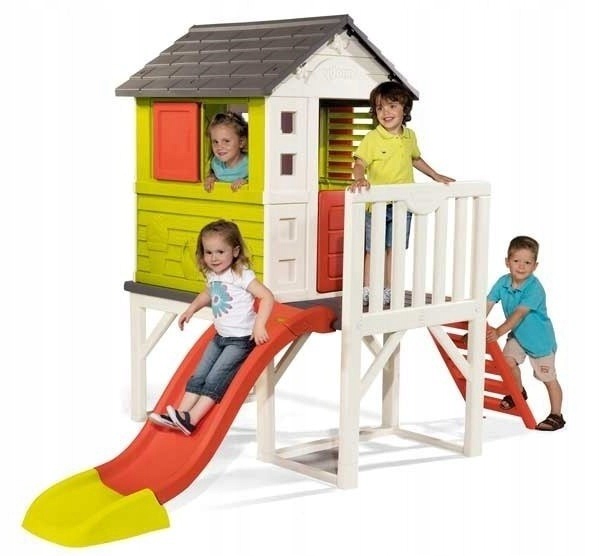 - Несомненная привлекательность дома на ходули — это горка с длиной горки 150 см, к которой можно подключить садовый шланг, который превратит ее в водную горку.