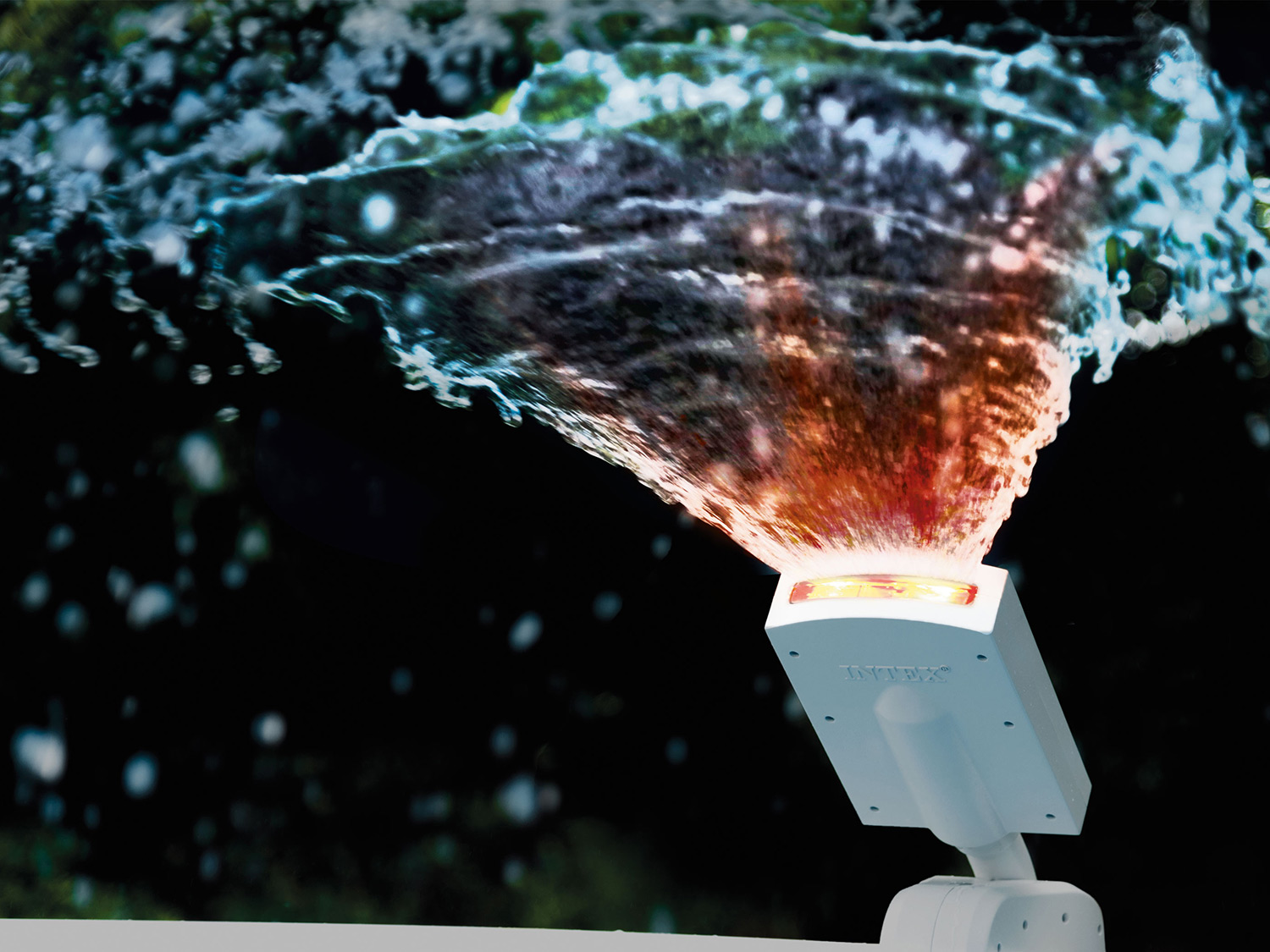 Купание в частном бассейне – это удовольствие, которым вы можете наслаждаться, не выходя из собственного сада. Однако компания INTEX позаботилась о том, чтобы ваша ванна была не только приятной, но и уникальной. И все это благодаря светодиодному распылителю воды. Теперь разнообразить отдых в бассейне можно разноцветными лучами, сияющими сквозь водные каскады. Благодаря встроенному светодиодному освещению разбрызгиватель создаст дополнительный уникальный визуальный эффект, когда вы захотите воспользоваться бассейном.