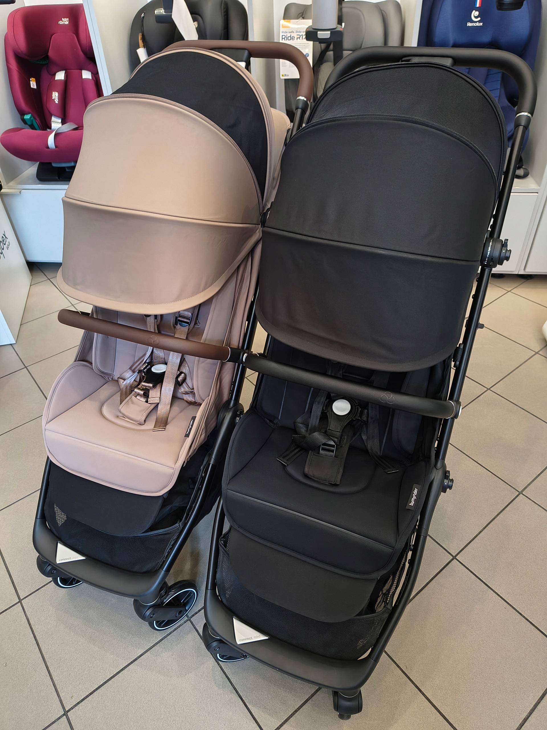 Благодаря запатентованной магнитной системе в Connect Mini вы можете соединить две коляски в версию для близнецов или установить дополнительные аксессуары.