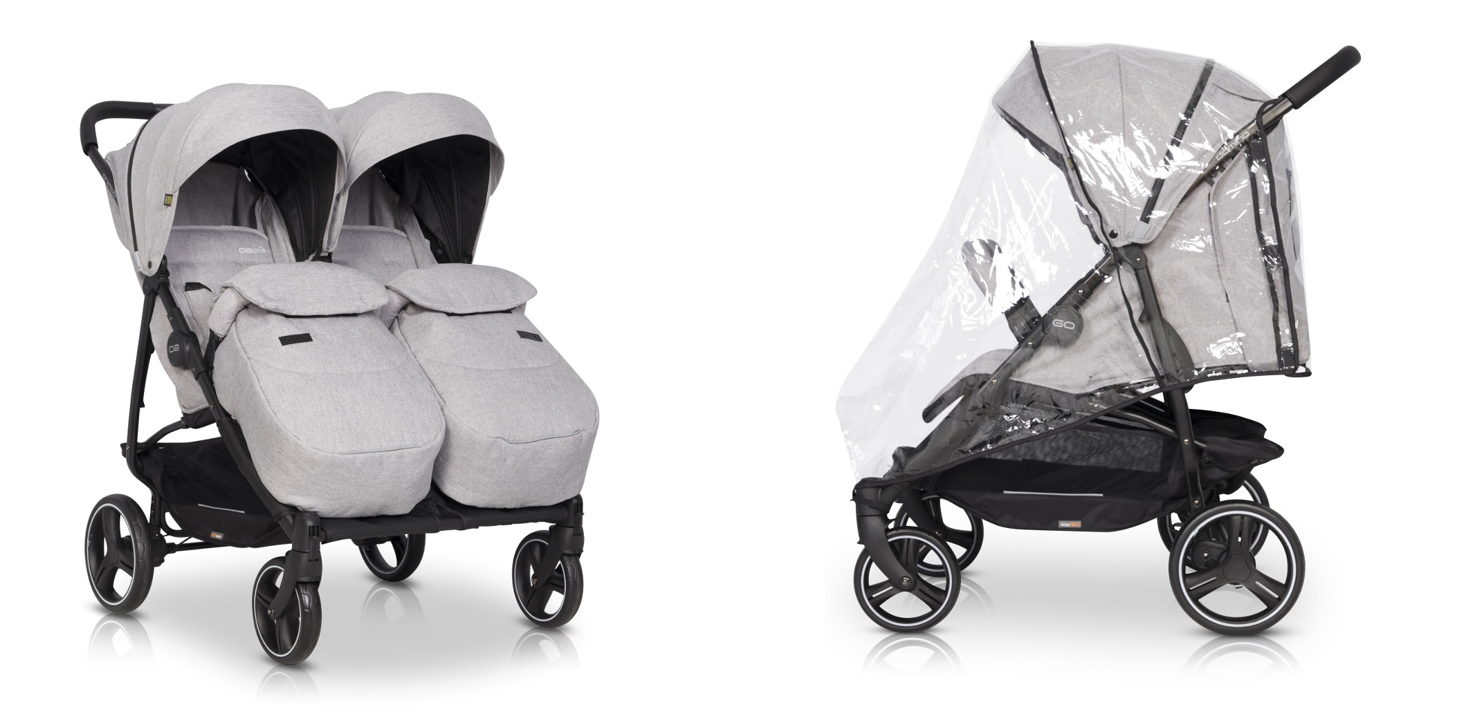 - Современная коляска, предназначенная для двойняшек и детей год за годом - она оснащена два сиденья 0+ позволяют перевозить малышей с первых дней после рождения.