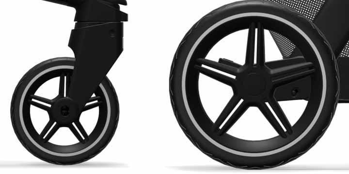 Колеса коляски Hub+ устойчивы к проколам — их конструкция усилена и обработана совершенно новый профиль. Благодаря этому колеса не только безопасны при движении по неровной, дикой местности, но и значительно улучшена их маневренность. Все колеса амортизированы, поэтому вы не почувствуете затруднений при подъеме на бордюры или прогулке в парке. Передняя часть — стандартная — поворотная, с возможностью блокировки для движения по прямой.
