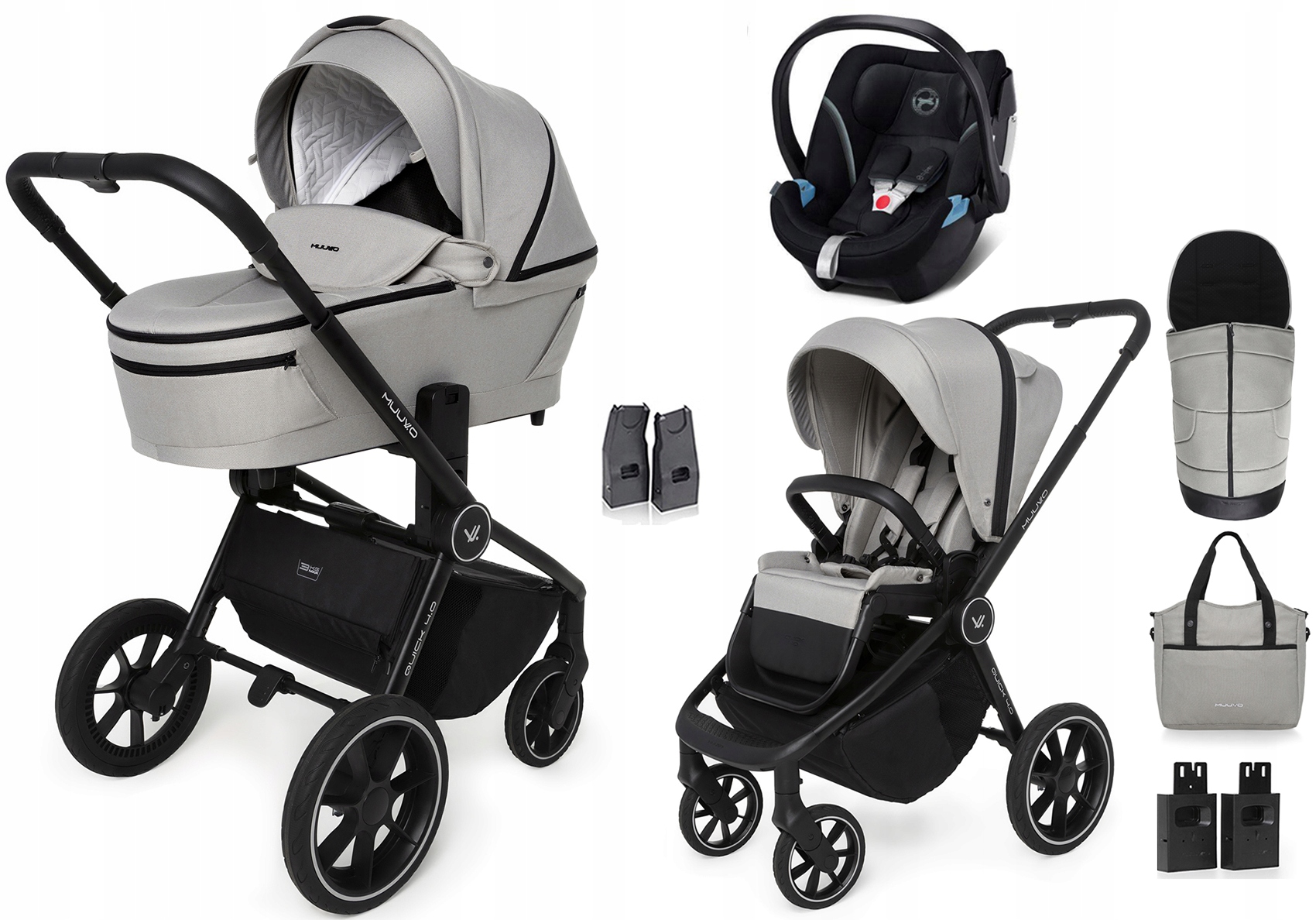 Коляска MUUVO QUICK имеет функцию крепления автокресла к раме коляски с помощью специальных адаптеров. К данной модели подходят сиденья таких брендов, как: Cybex, Maxi-Cosi, BeSafe, BabySafe, Avionaut.