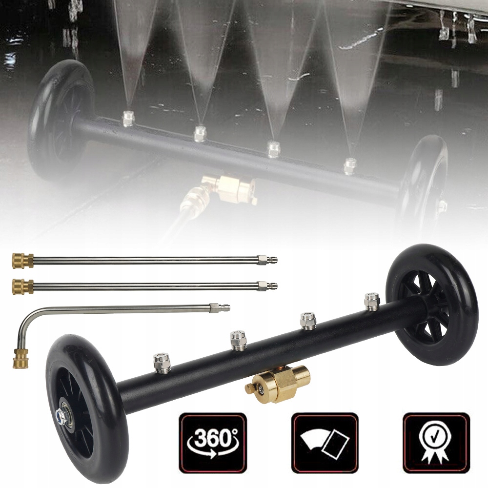 - 15-дюймовая мойка днища, подходящая для горячей и холодной воды. Прочная конструкция, 2 гибких резиновых колеса для легкого перемещения и 4 насадки для увеличения очищаемой поверхности.