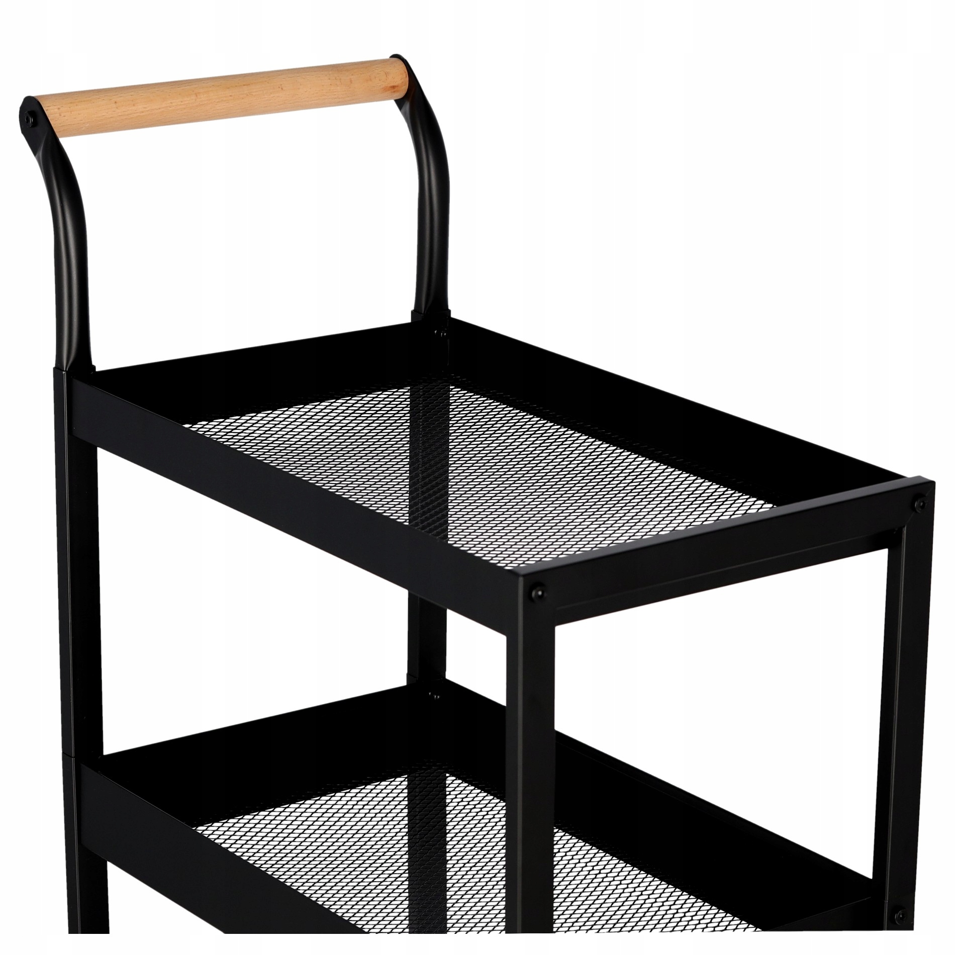 Помощник на колесиках из нержавеющей стали с порошковым покрытием. Он имеет три большие полки. Полка на поворотных (360°) колесах. Два из них имеют замок, благодаря которому коляска устойчиво стоит даже на неровной поверхности. Он имеет прочныеручки для удобной переноски.