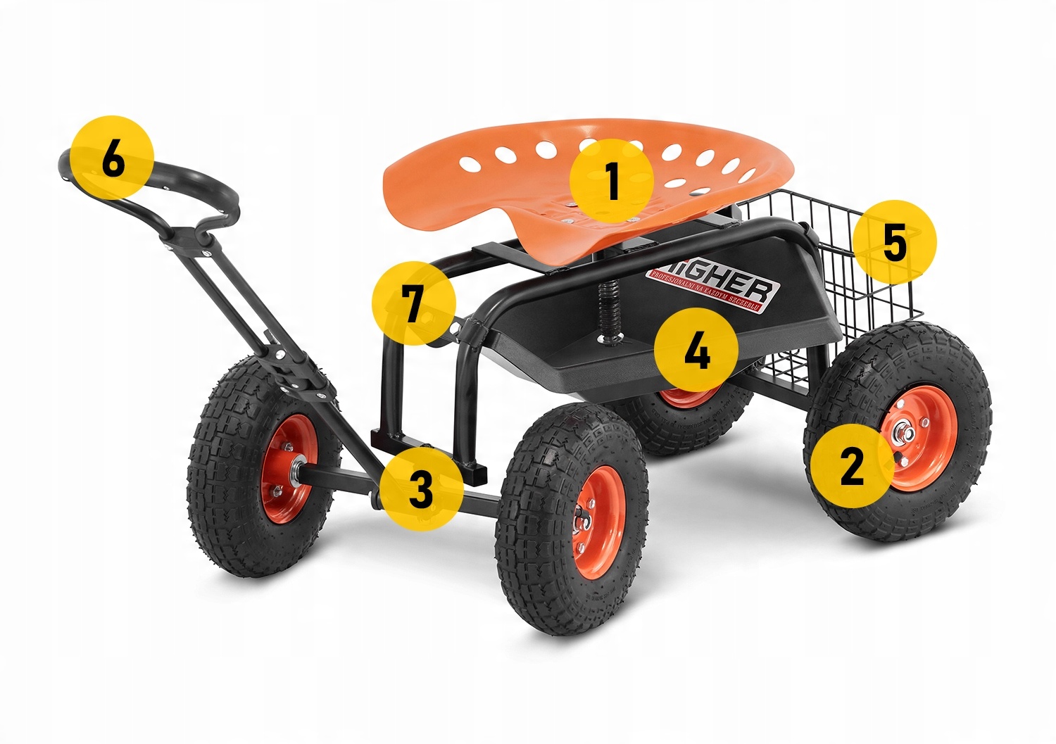 Садовая тележка HIGHER, состоящая из удобного профилированного сиденья с функцией поворота на 360 градусов и регулировкой по высоте, позволяет выполнять большинство садовых работ в положении сидя. С помощью садовой тележки можно удобно подстригать кусты, сажать и собирать урожай фруктов и овощей. Садовое сиденье позволяет занять положение, щадящее позвоночник, ноги и колени – избавляет от необходимости наклоняться или приседать. Чтобы отрегулировать оптимальное положение, высоту сиденья можно плавно регулировать. Он также имеет возможность вращаться на 360°, что делает его использование еще более комфортным. Коляску не нужно поднимать, поскольку она оснащена четырьмя надувными резиновыми колесами, которые прекрасно справляются с неровностями местности, такими как трава или неровная земля. Для буксировки коляски используется эргономичная стальная ручка с нескользящей ручкой. Ручку можно отрегулировать под свой рост – она плавно регулируется. Вы также можете взять с собой в коляску инструменты, которые можно хранить на полке под сиденьем или в специальной стальной корзине за сиденьем. Хоть коляска и не игрушка, мы знаем, что детям она нравится и они наверняка с большей охотой займутся садоводством :)