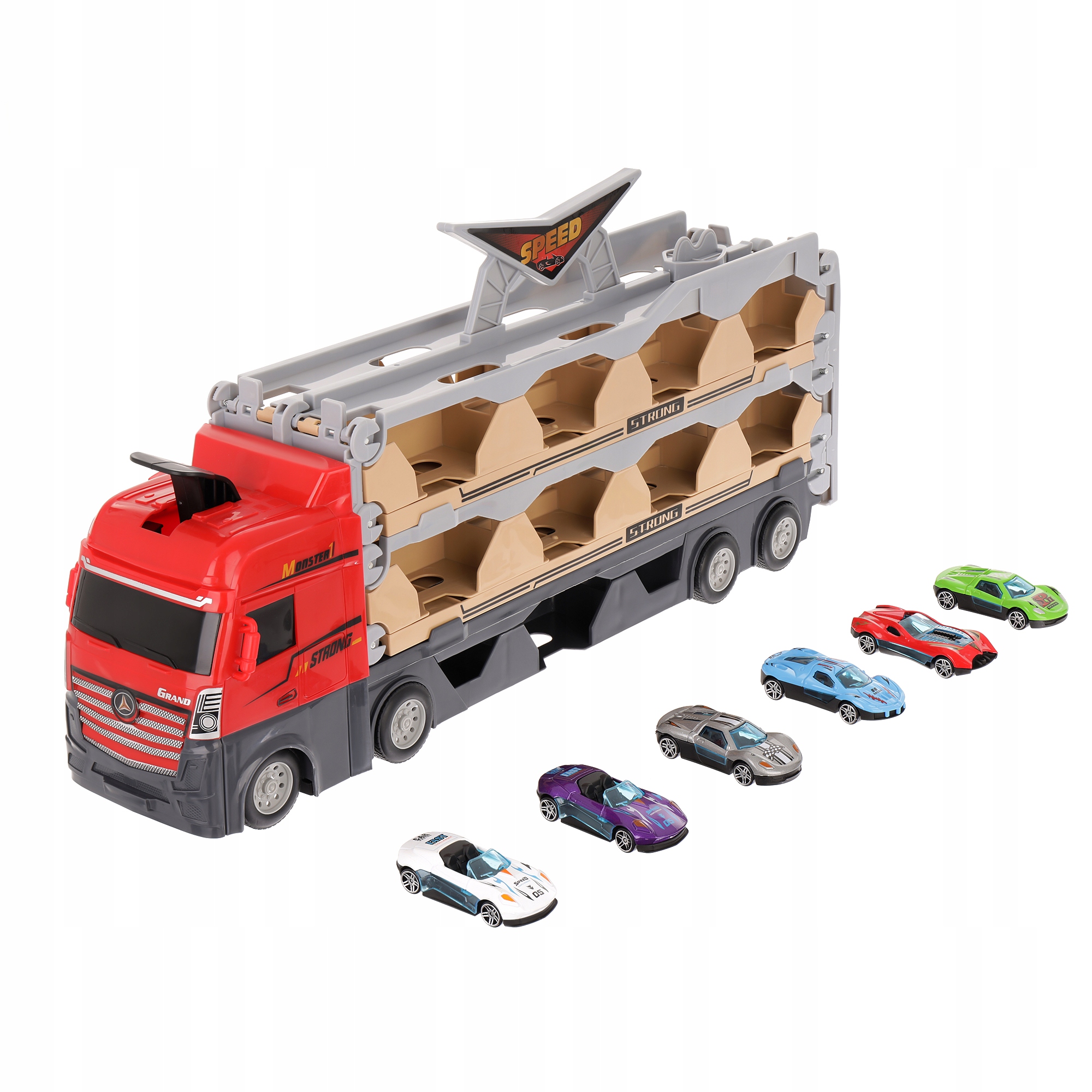 В комплект входит прицеп, который также является местом для хранения машин и пусковая установка . В набор входят 6 машин разных цветов. Эвакуатор раскладывается в длину до 2 метров, что делает его необыкновенным ощущением для каждого ребенка.