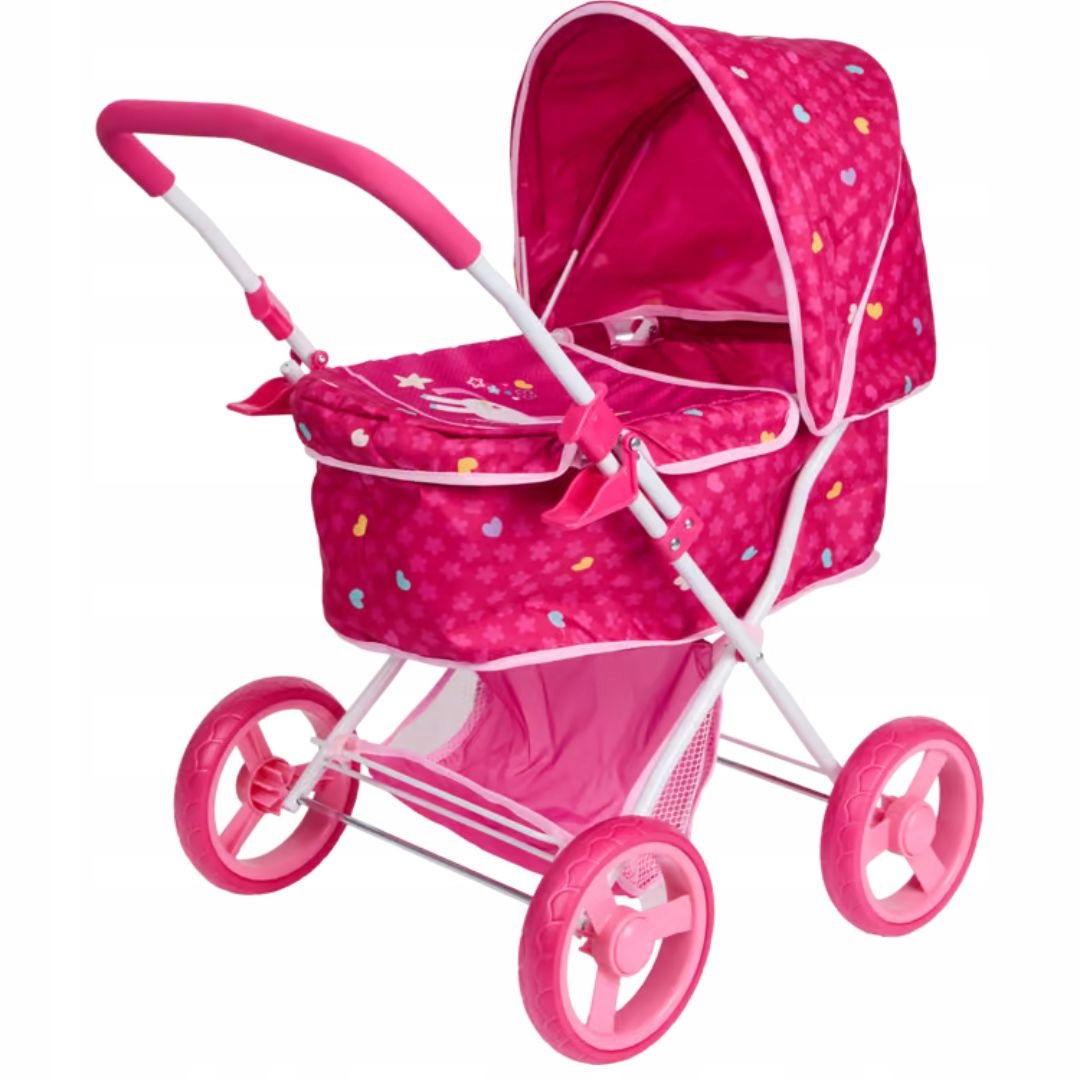 В коляске можно разместить кукол из популярных серий игрушек, таких как Baby Born или New Born Baby. Он розового цвета с яркими элементами, оснащен складным розовым капюшоном и регулируемой ручкой, покрытой пеной, которую можно отрегулировать по росту ребенка. Имеет колеса, пластиковый контейнер для аксессуаров, расположенный внизу коляски, и съемное одеяло. Имеет легкую металлическую конструкцию. Коляску легко сложить, что упрощает ее хранение и транспортировку.