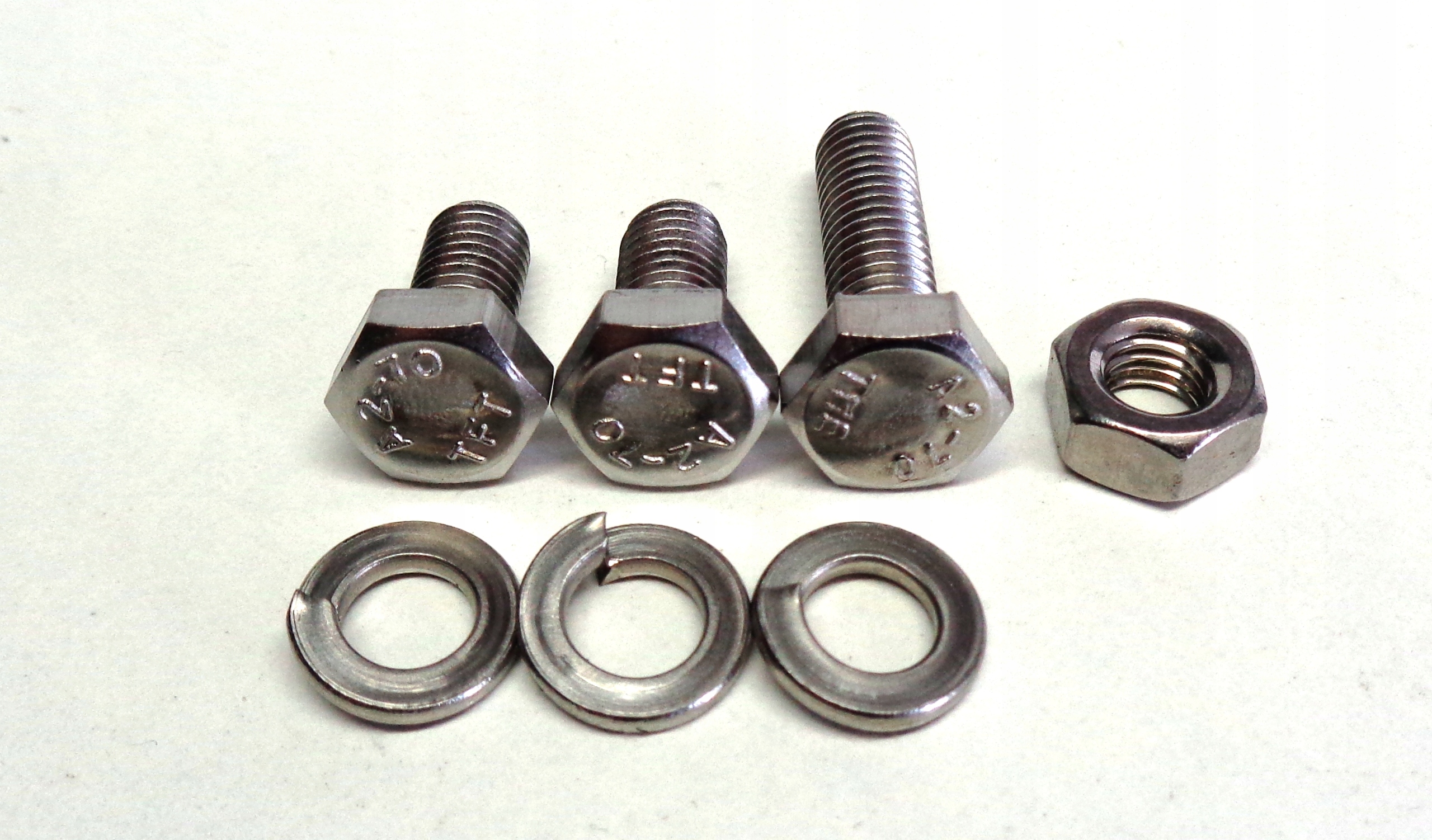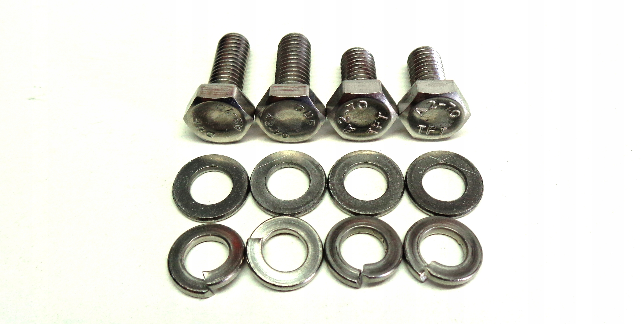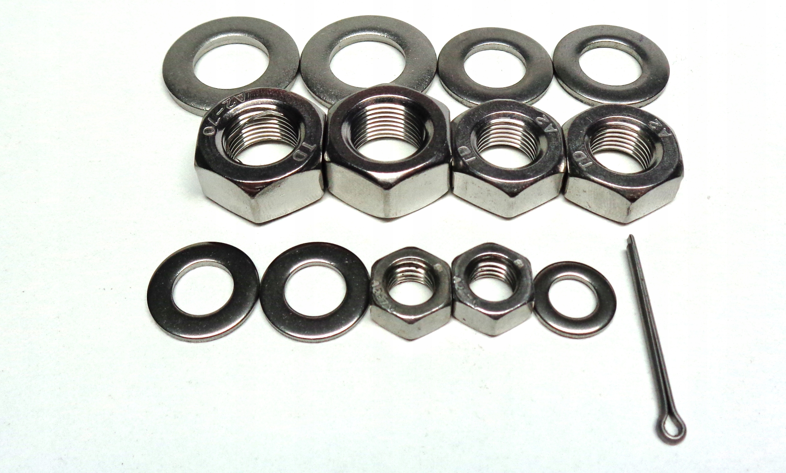 Комплект состоит из хромоникелевых элементов из нержавеющей стали, выполненных класса А2 70. В комплект входят разделенные винты, винты, гайки и шайбы. на 10 отдельно упакованных групп, что обеспечивает беспроблемную установку отдельных компонентов мопеда. Дополнительно в группу РУЛЕВ добавлены два винта М10х1 из мелкой стали с оцинкованным покрытием класса 10,9. В группе КОЛЕСА в комплект входят винты, гайки и шайбы для крепления звездочки заднего колеса. Добавленные стальные винты М7 оцинкованы до класса 8,8.
